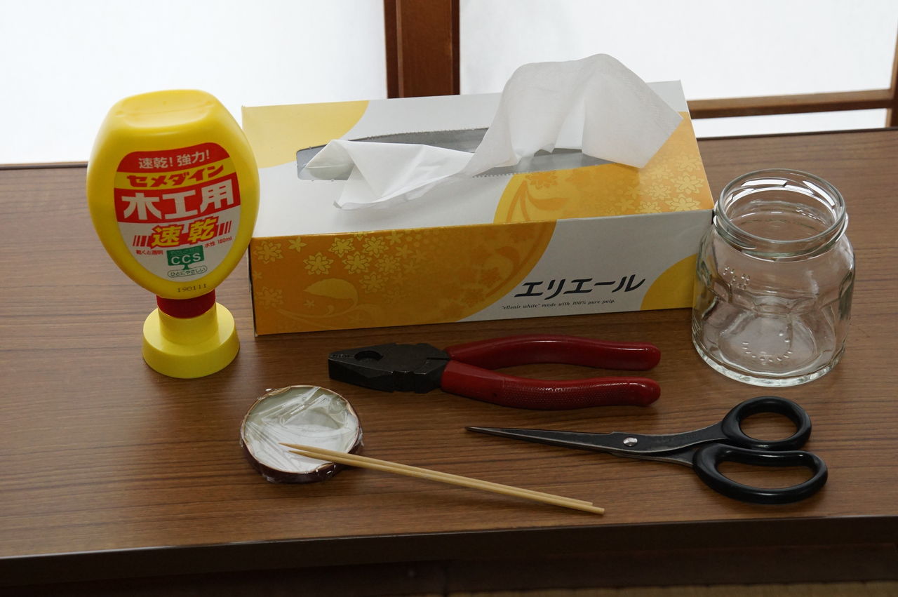 それから、ボンド、ティッシュ、竹串、ボンドを出しておくための皿、ペンチ、ハサミ、定規などを用意します。