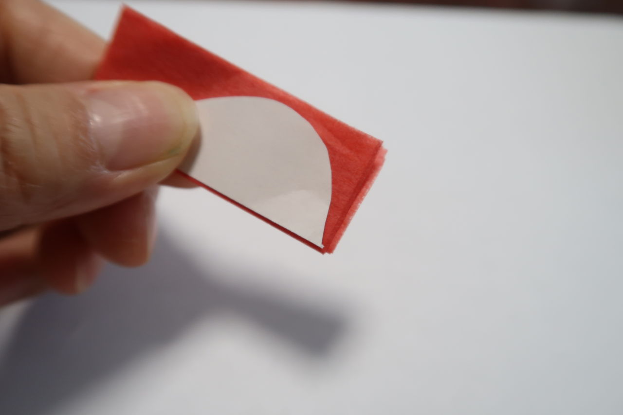 photo by Taiyouzin針金21番に花造りテープ緑を巻いておきます。針金の先は0.7cmくらいに折ります。ペンチで5mm挟んで曲げると、大体7mmに折ることが出来ます。ティッシュ2×2㎝を半分に折り、挟んでペンチでしっかりおります。ボンドを付けて段差をなくすように巻いたのち、作る花の色で白が見えないようにくるみます。約2㎝×2㎝でくるまります。