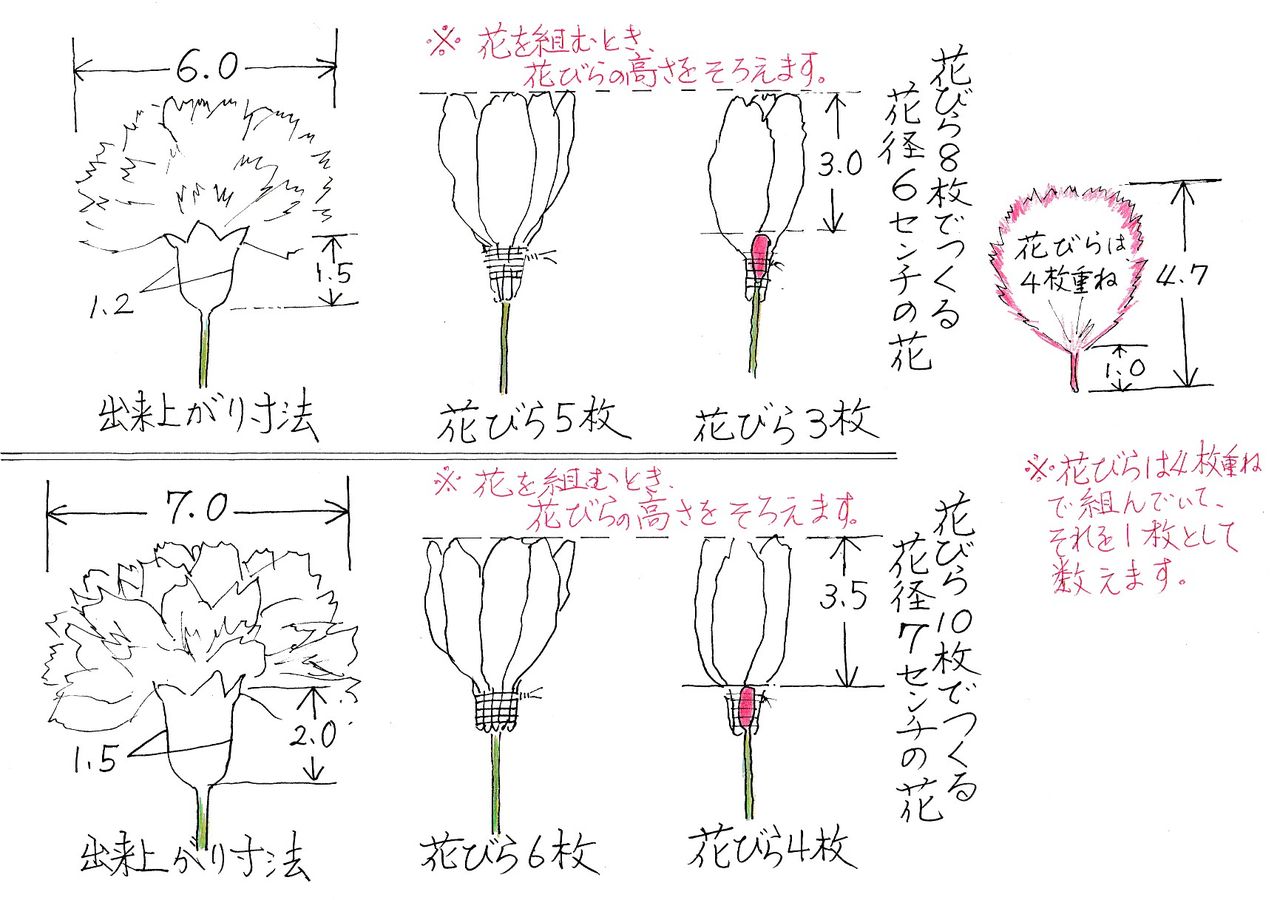 花びらは、4枚を一つにまとめています。それを一つと数え、花径6cmの花は、花びら8枚で、花径7cmの花は10枚で組むと綺麗に仕上がります。