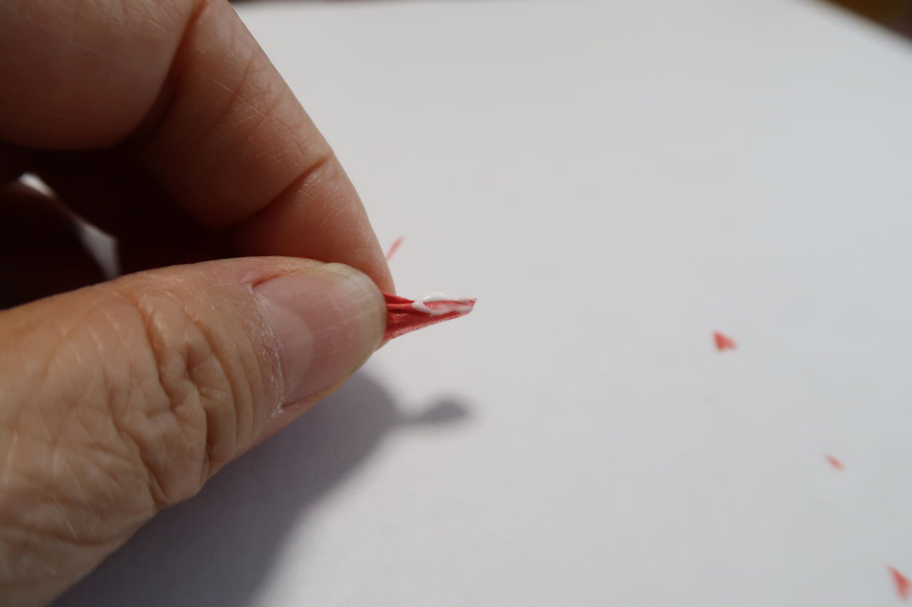 photo by Taiyouzin花びらの下の方をアコーディオン状にたたみ、少しだけボンドを付けて、親指と人差し指でこよりを作るようにねじりまとめます。