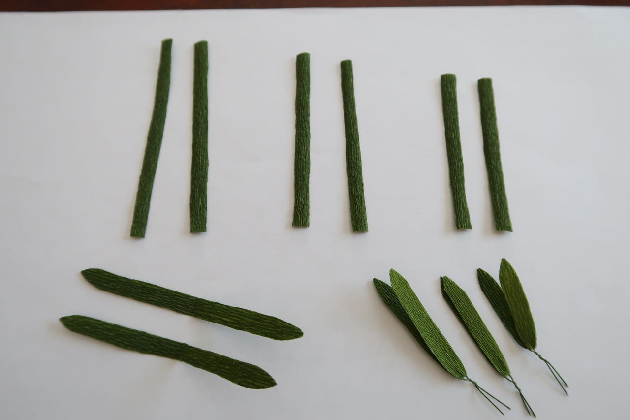 お花づくりテープは、4cmから6cmくらいにそれぞれ切り分けて置き、葉一枚一枚取り付けるとうまくいきます。巻き付ける分量は葉を0.5cmくらい一緒に巻き込むとしっかり止まります。