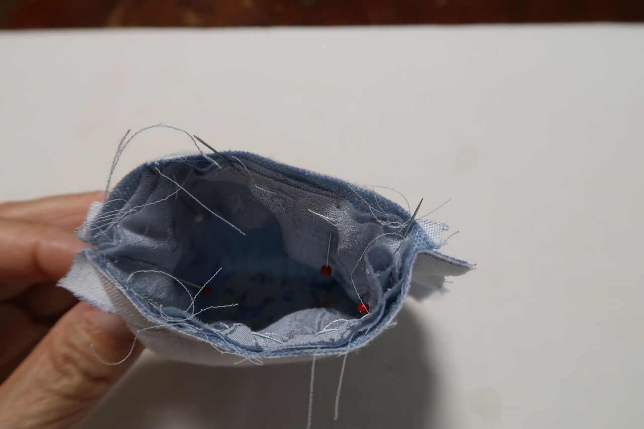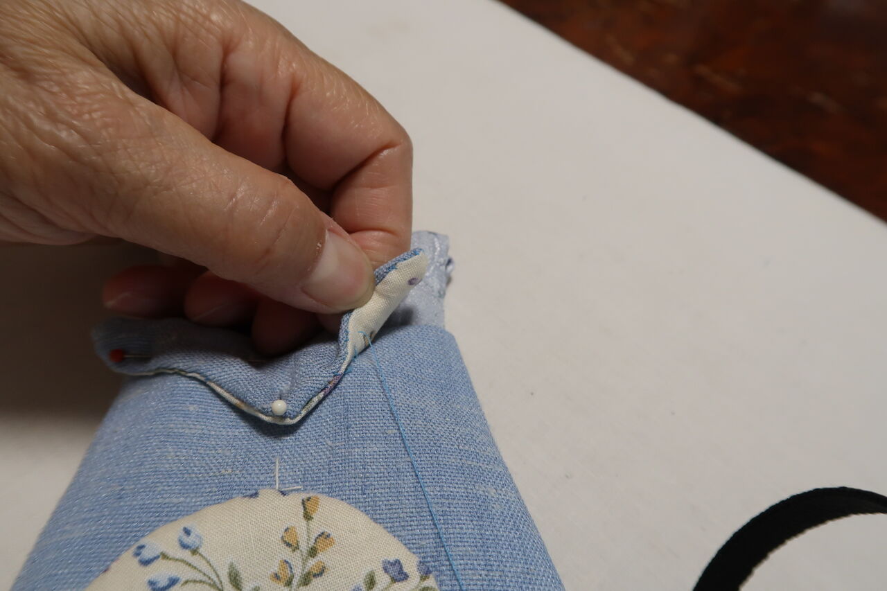 12、本体を中表にし、内袋は、外表にし、ひも通しの布を本体に取り付けた糸を隠すようにまつり縫いをします。