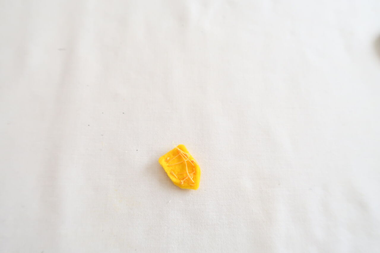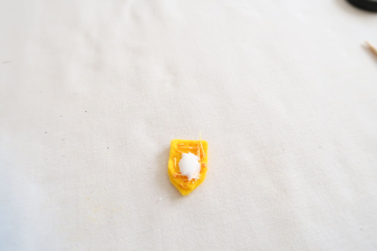 裏にボンドをつけて竹串などで広げ、ミミズクの顔にクチバシを貼り付けます。ボンドでステッチがほつれにくくなります。
