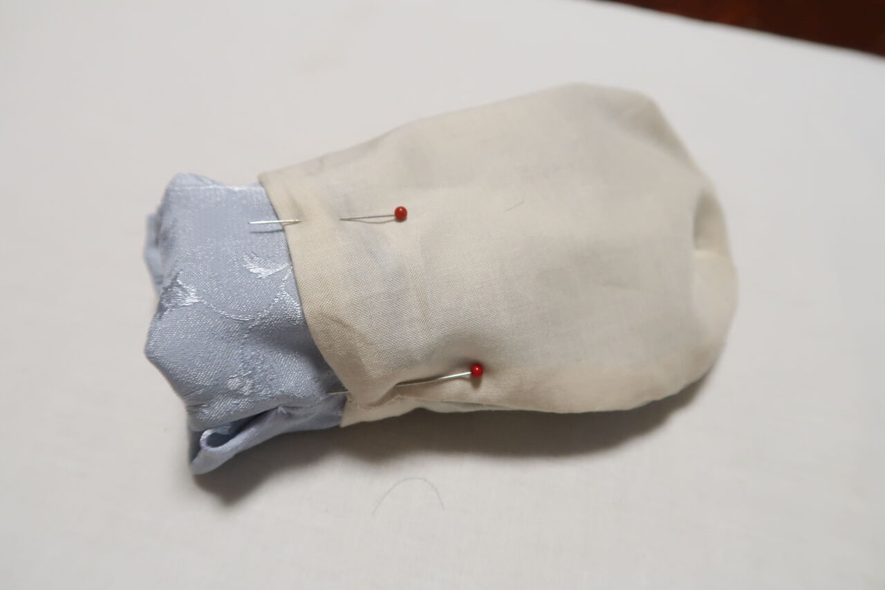 10、本体に糸通し用の布を取り付けます。本体の印と、チャコペンで付けた印を合わせて待ち針で細かく止めて縫います。