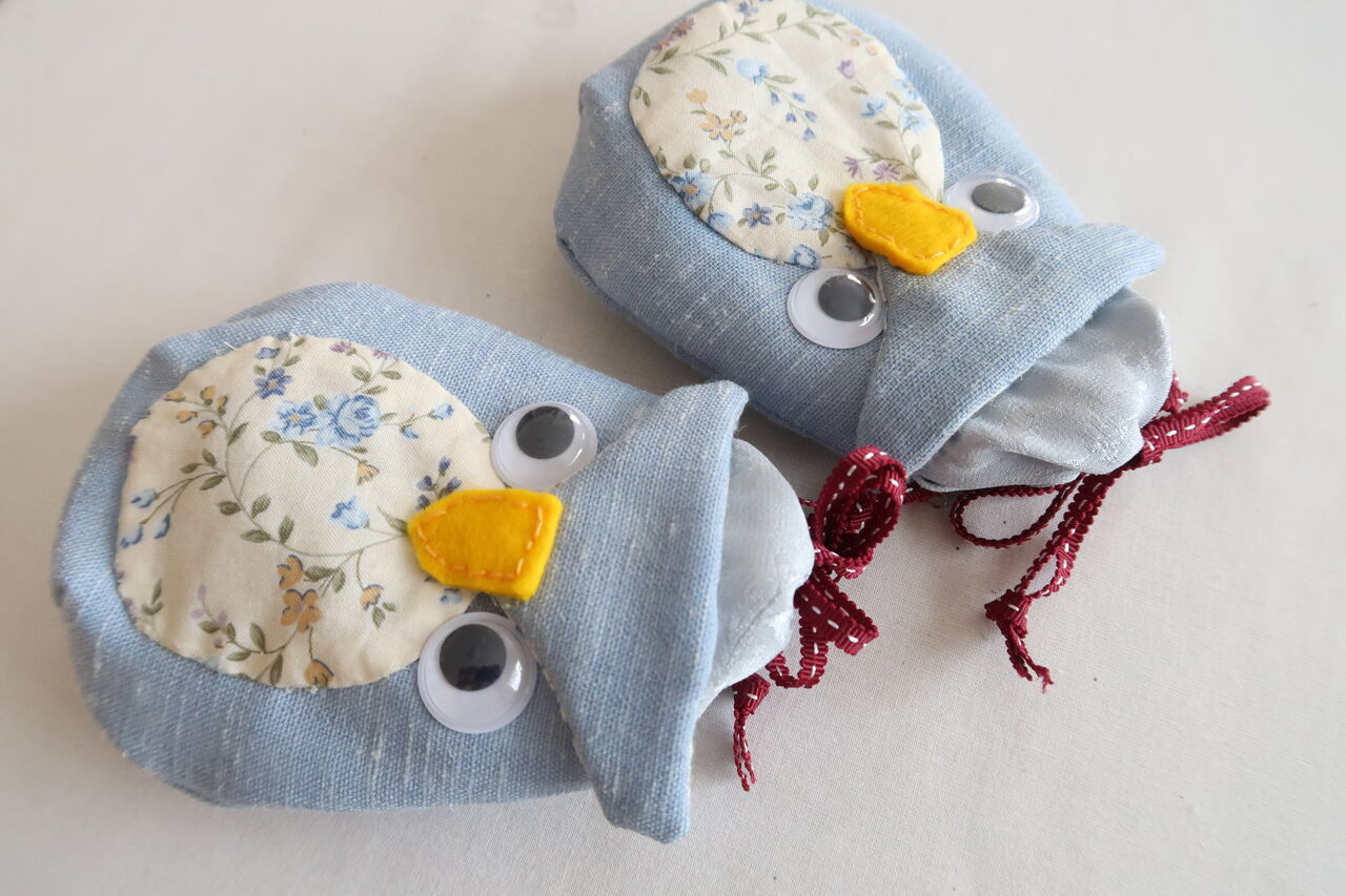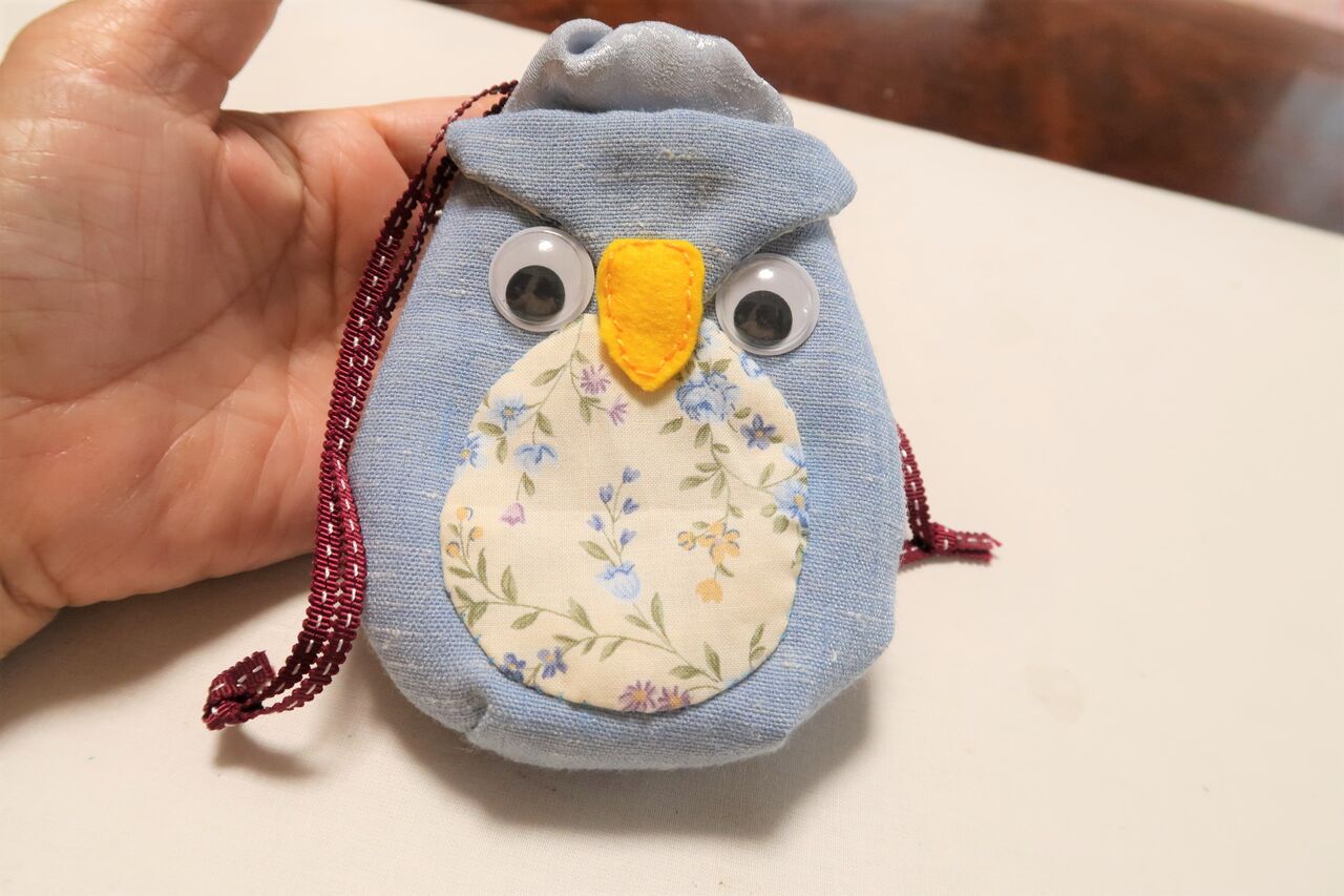 せっかく作るのなら、毎日見ていて飽きない、そしてほっこりするようなものを作りたいと思いました。大好きなミミズクの形をした袋を作ることにしました。