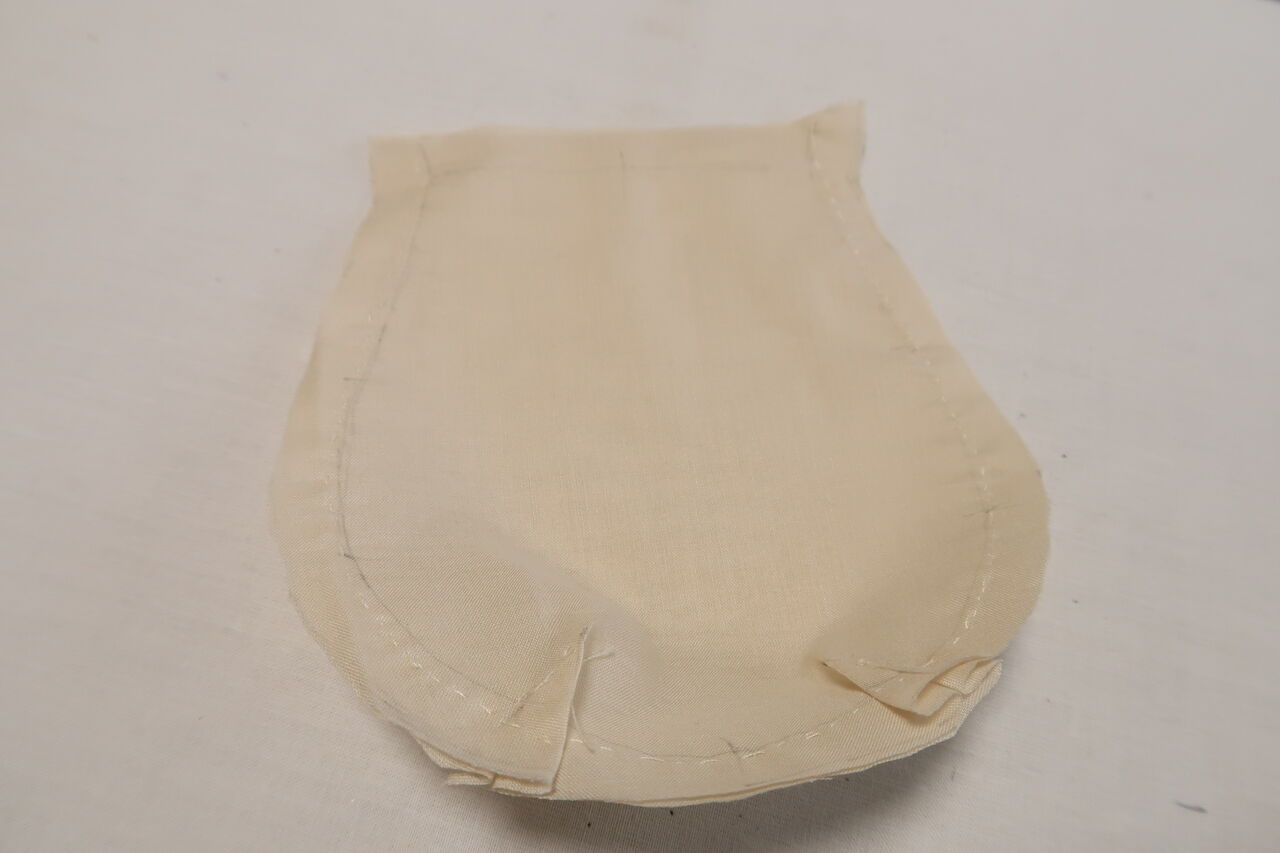 7、内袋を縫います。まず、ダーツを縫います。縫い代部分は縫いません。次に布を中表にし、袋部分を縫います。線より1ミリ外側を縫います。縫い終わったら、縫い代を揃えてカットします。
