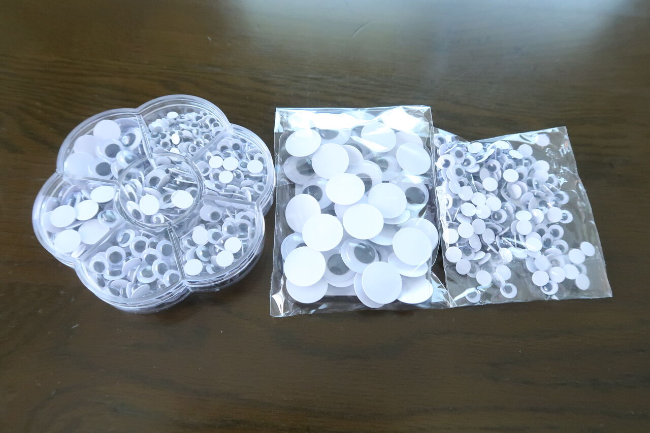 目玉・直径1.2センチ2個、百円ショップなどでも売られているそうです。フェルトで作ってもいいです。