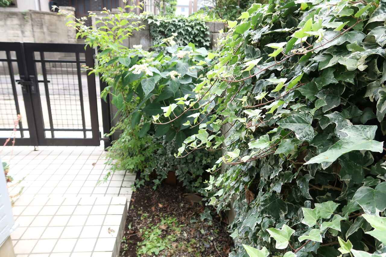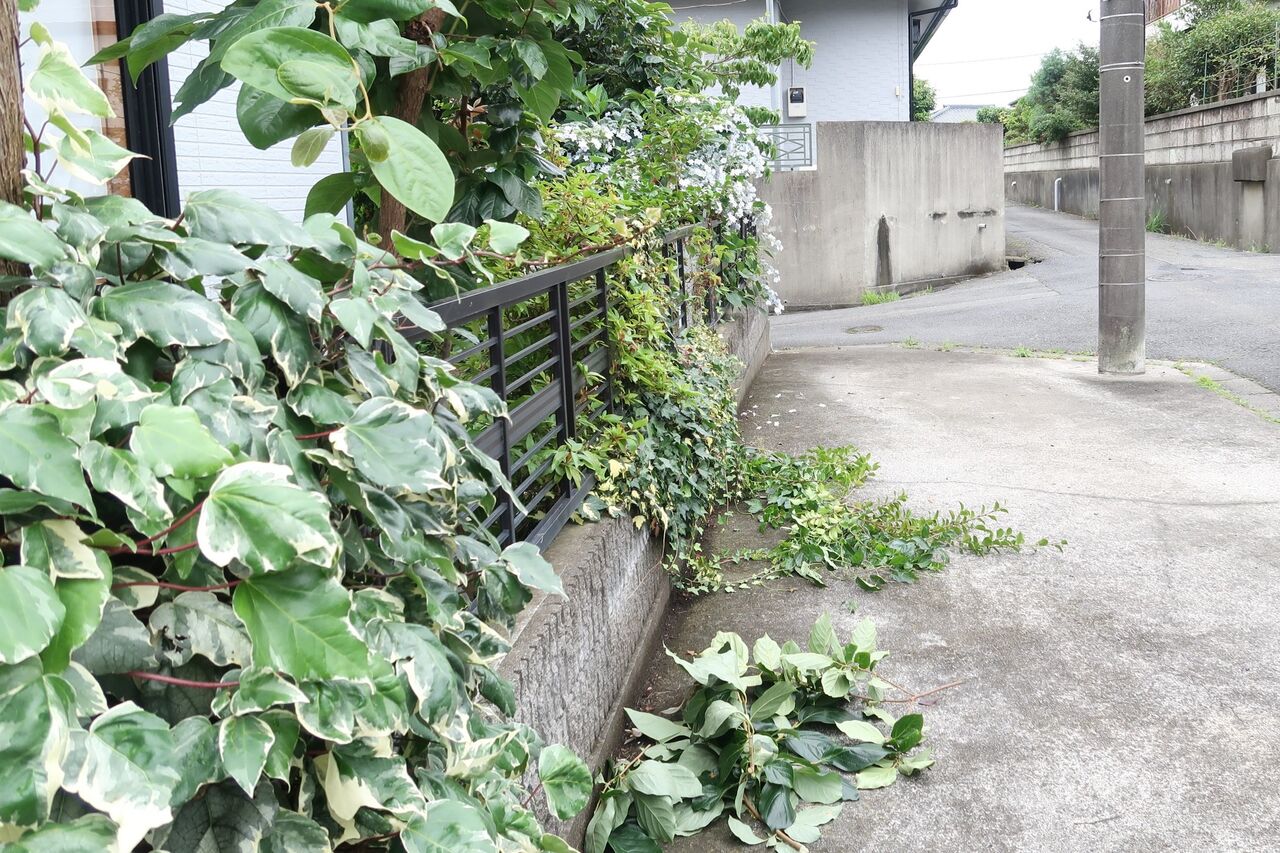 通路側に伸びていたアイビーのツルや、柿のひこばえなどを整理しました。