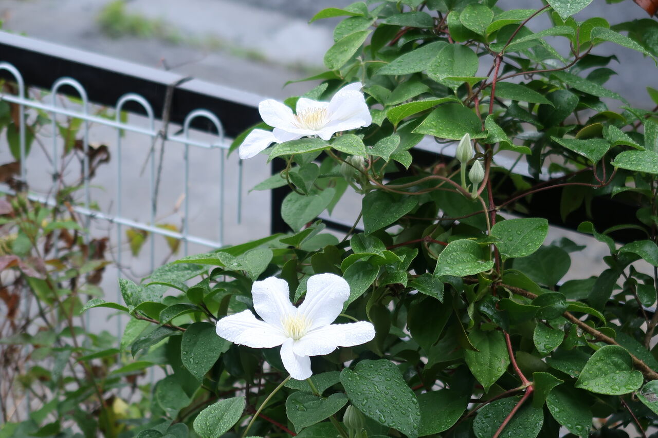 3月に強く剪定してしまったクレマチスが遅ればせの開花となりました。花が小さいので、しっとりと野にある風情です。