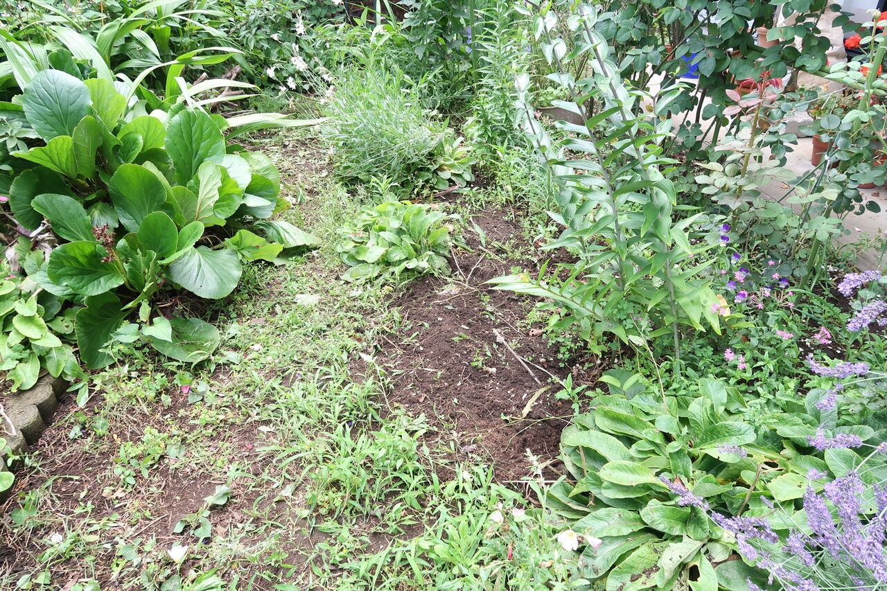 ユリの周りの草花も抜きました。ユリは草取りの時、不覚にも、小さい芽をぬいてしまいました。ショボ~~~ン・・・・