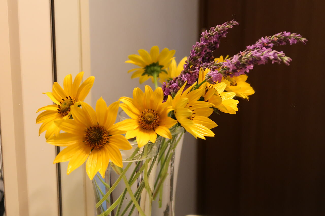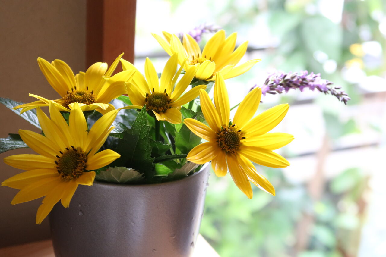多分またしばらく、体調回復と雨降りとで庭に出られないかもしれないので、ラベンダーと姫ヒマワリを活けました。