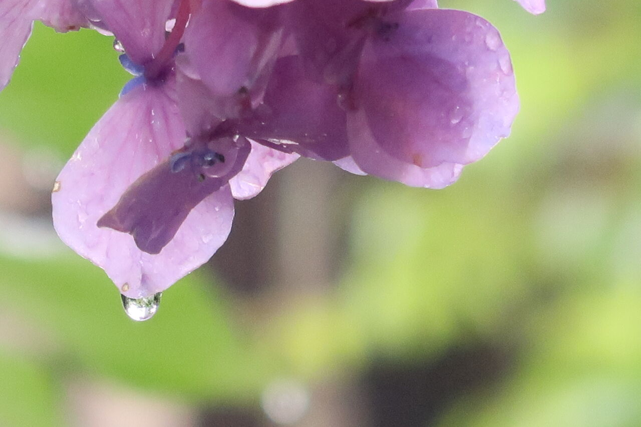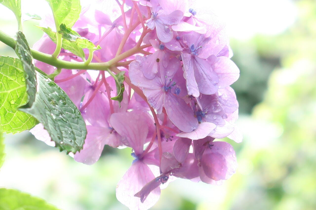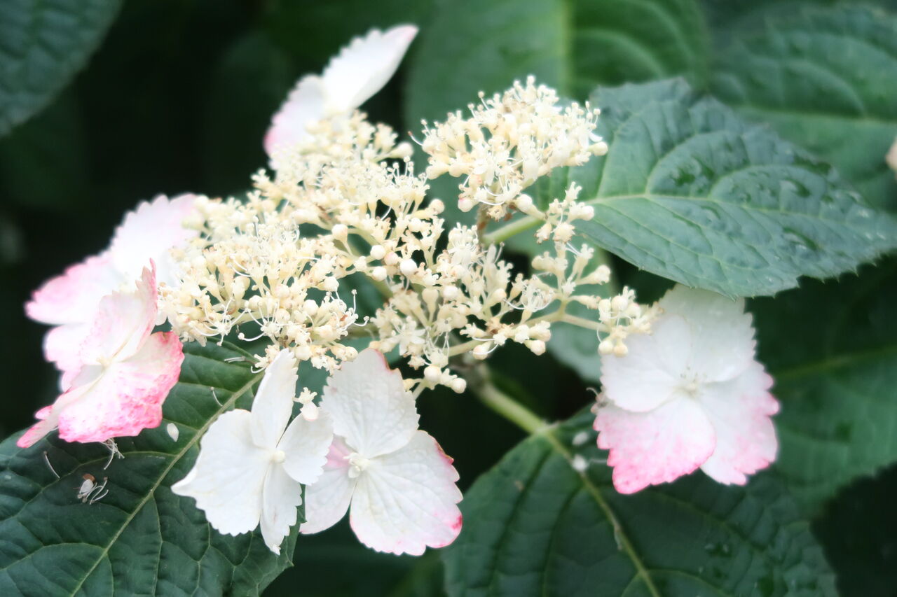 ガクアジサイの「紅」です。「紅」は太陽が当たって初めて赤く色づく品種。ここはあまり光が当たらないのでいつもほんのり色づいて終わりです。雨の多い年は純白のままです。水滴があまりありませんでした。