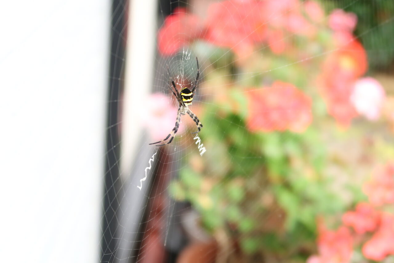 リビングの出入りする窓の近くに巣を構えたジョロウグモ、最初は下の方にかけていました。しかも、通る度ビクビクして巣の端に避難していましたが、今は高い位置に巣を掛け、私が出入りしてもピクリともしません。クモも覚えちゃうんですね。それにしても一番虫の来ない場所に巣を掛けたのでは・・・