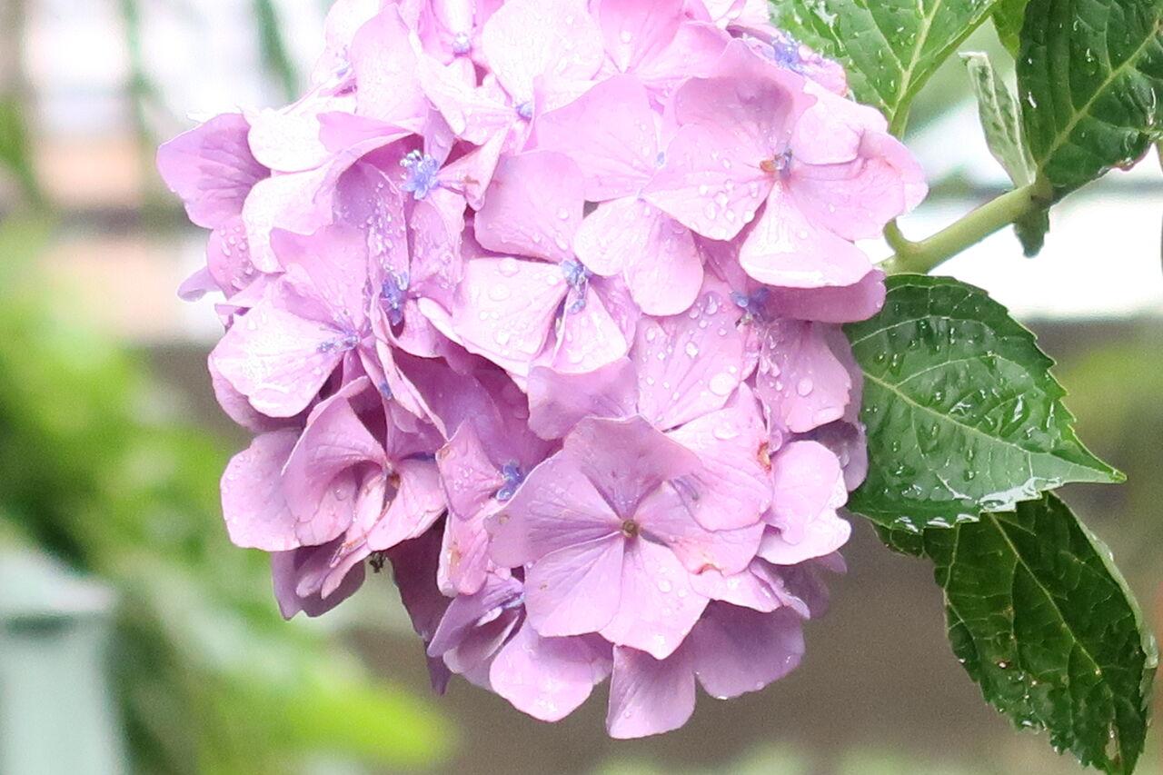 紫陽花の隣にあるヤツデの葉の上にたくさんの水滴があって、風が吹くとその水滴が落ちます。大きな葉の上に落ちるとバラバラ音がして、雨の日に傘をさして木の下を歩くときの感じがします。