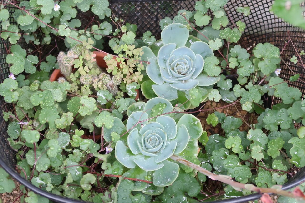 雨のかからない所に置いてありますが、水滴がかかっています。雨の凄さが分かります。蔓性のツタバウンランは成長が早く、籠を覆います。時々、むしって量を減らしています。