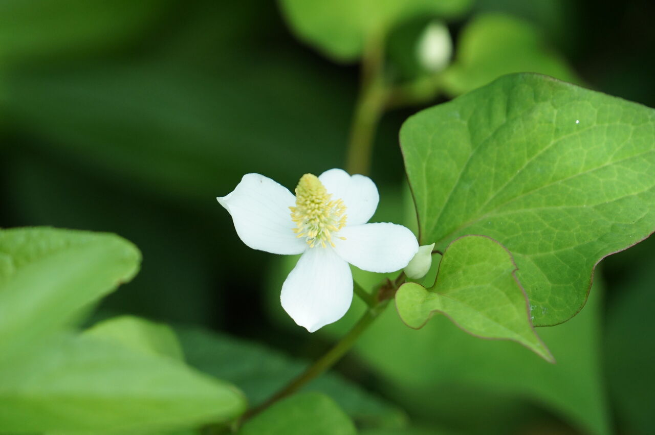 梅雨のころ真白な花を咲かせるのはドクダミです。薬草にもなるこの植物、白い花は好きですが、ドクダミの生命力にはまいります。