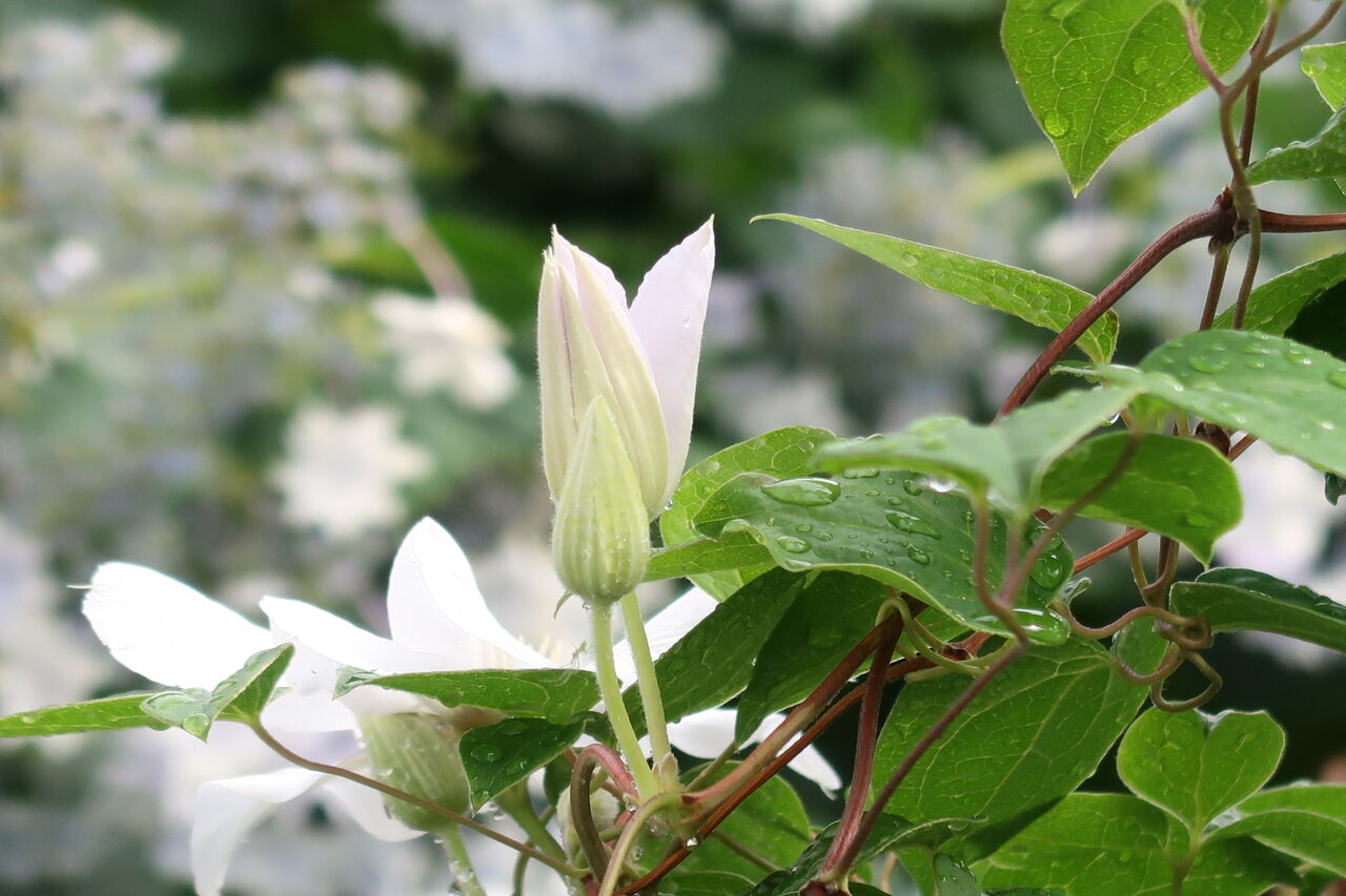 紫陽花「墨田の花火」を背景に白のクレマチス。