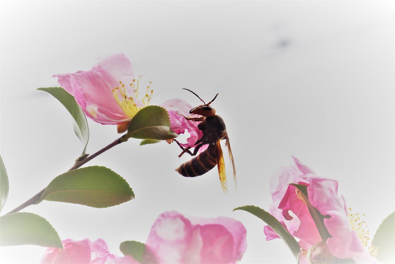 山茶花の花に来るオオスズメバチ。毎年山茶花が咲くとやってきます。団地内を一回りしてどこかへ飛んで行きます。蜂の道があるのか同じ方向から来ます。