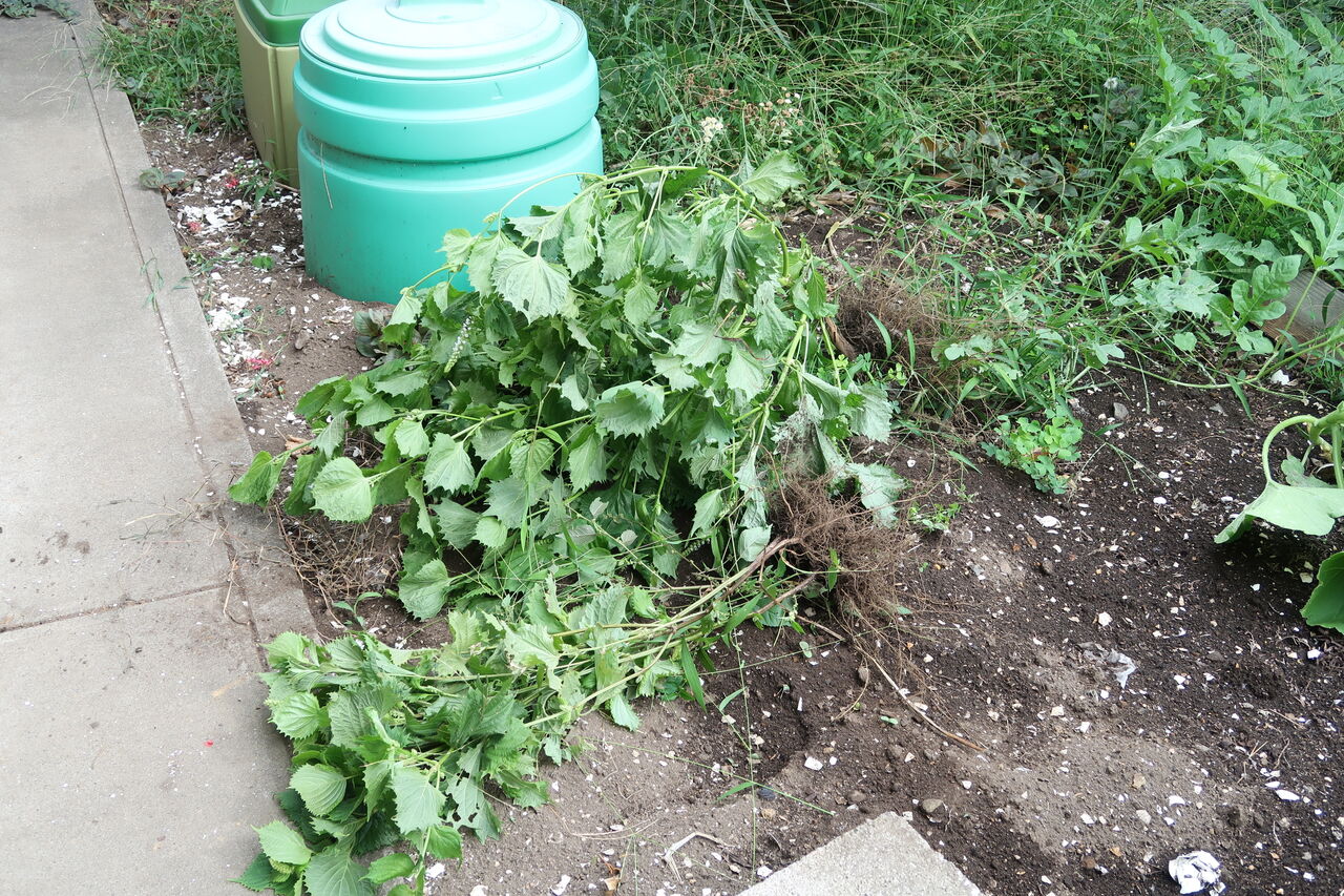 キイロスズメバチは青じその花の蜜を好んで採取しに来ます。キイロスズメバチのいないすきに抜いてしまいます。