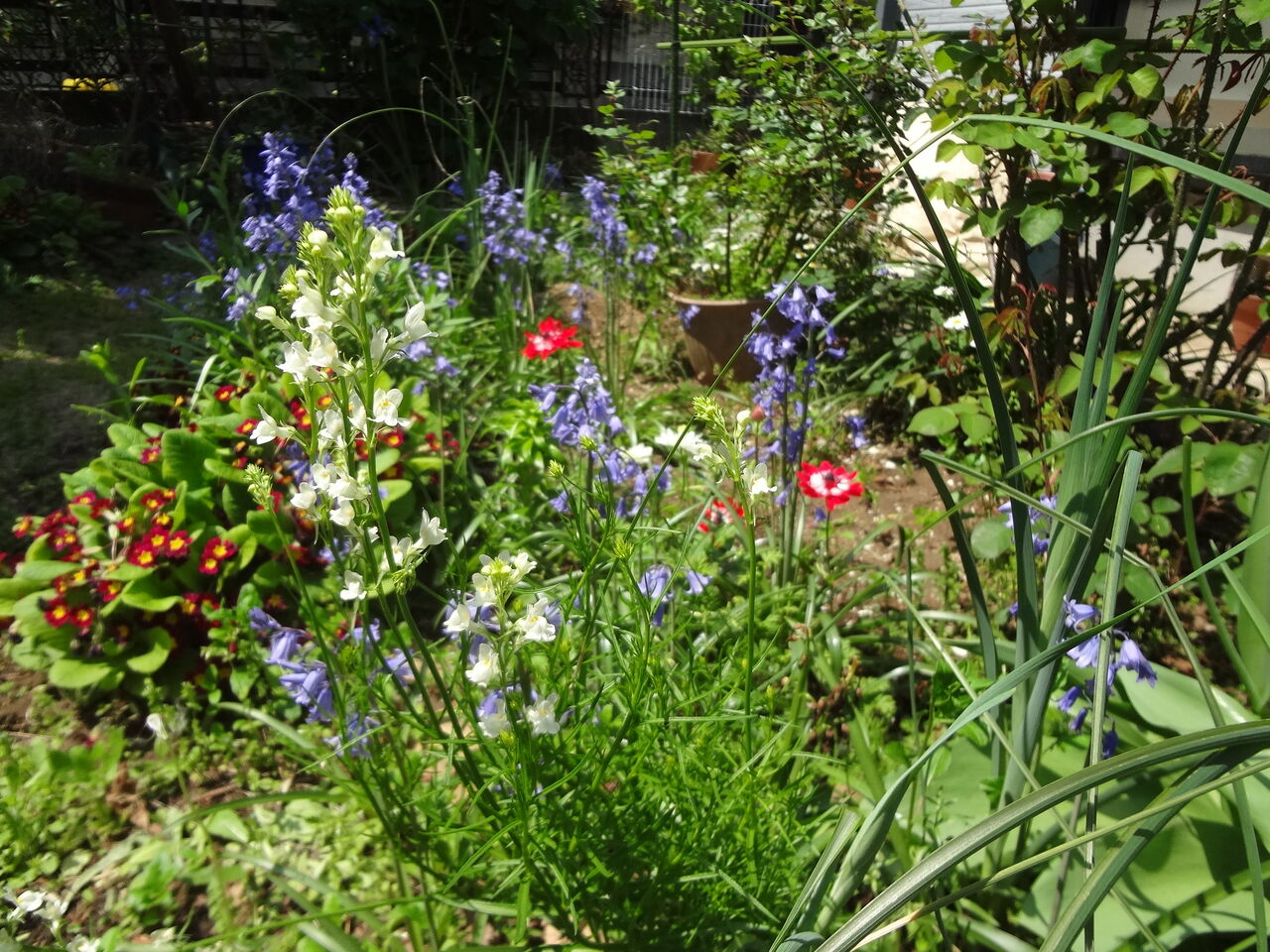 いつもごちゃごちゃ植えすぎ。でも次の年に花を見られるのは少ないので、一年草と思って植えています。これはたくさん咲いているのか、少なくしか咲いていないのかわかりません。