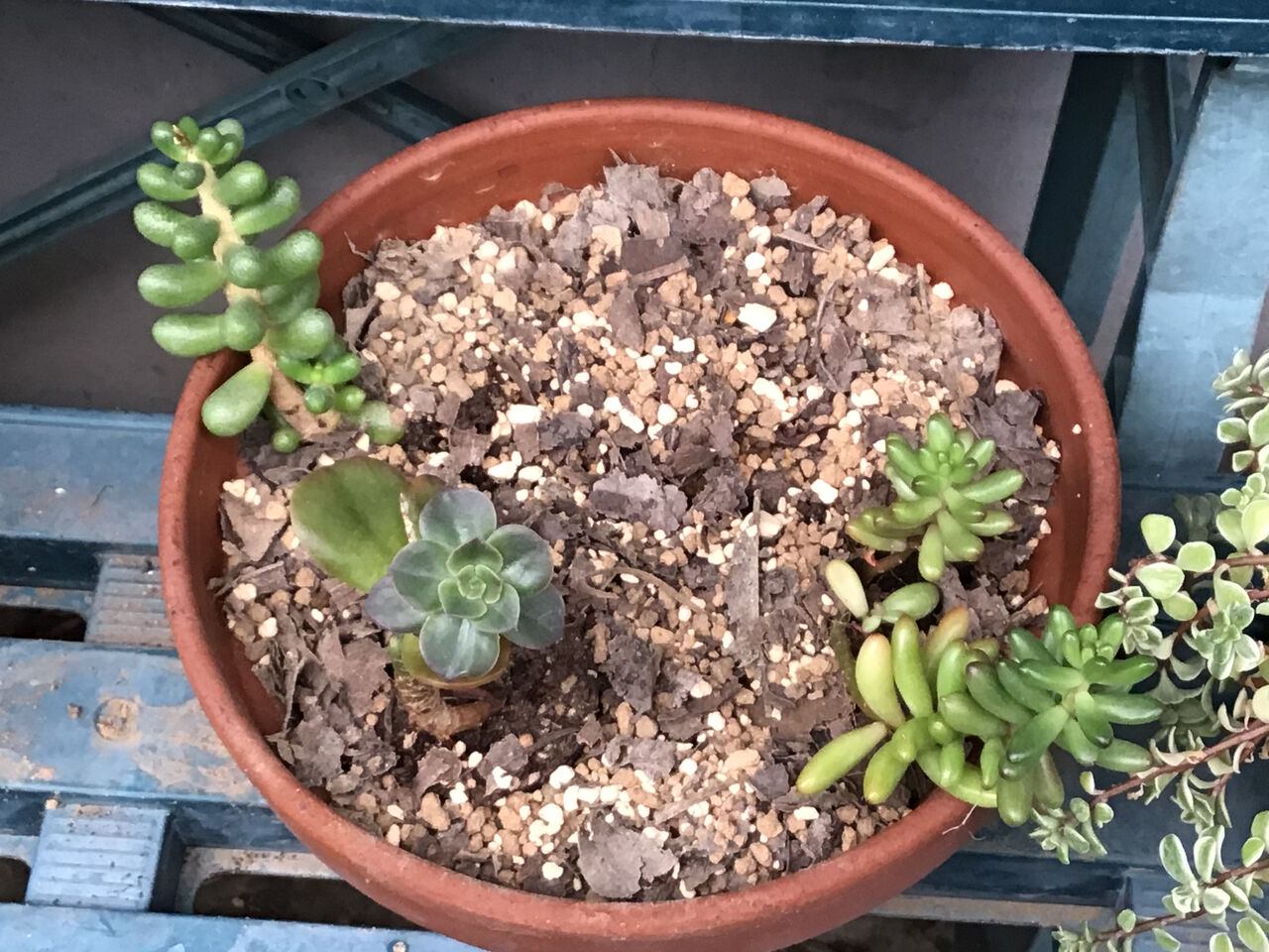 左から・・・斑入り丸葉万年草(セダム属)、緑亀の卵(ベンケイソウ科セダム属)、ブロンズ姫(ベンケイソウ科グラプトペタルム属)、アルブム(ベンケイソウ科 セダム属)