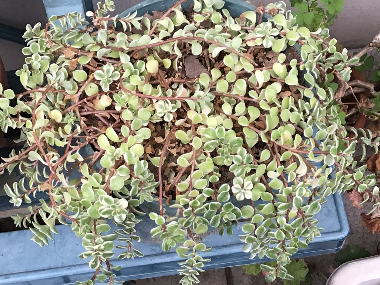 3月の多肉植物の様子。万年草がとてもはつらつとした状態でした。この時点で植え替えできていたらよかったですね。