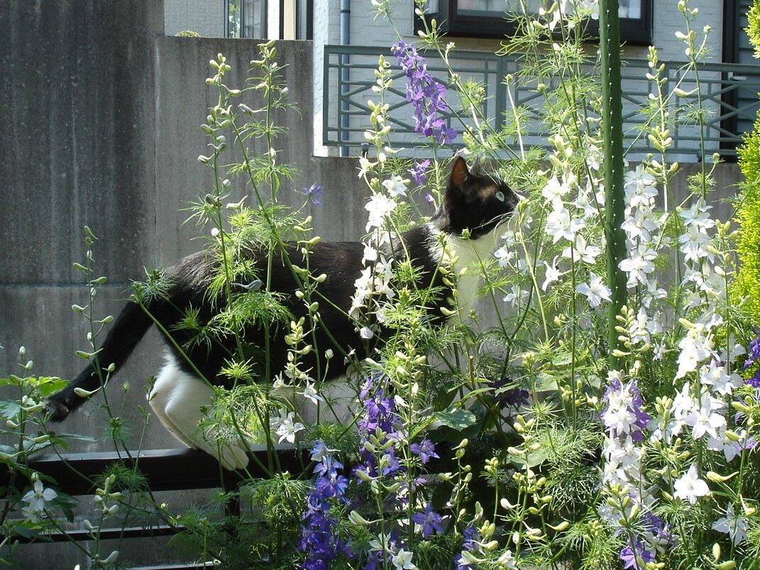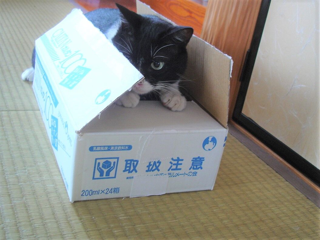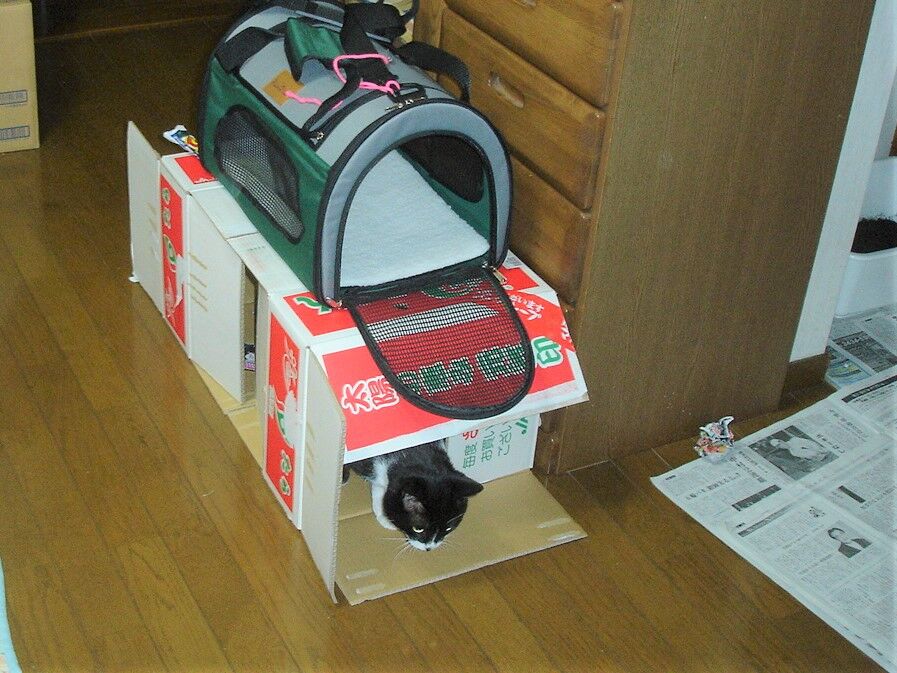 2008年5月のころ。箱を並べた遊び場が好きでした。キャリーバックに慣れさせるために、遊びながら入れたり出したりしていました。右側に黒く写っているのはトイレ代わりの庭の土です。家の中でトイレをさせるための工夫です。猫砂を少しずつ足していきました。