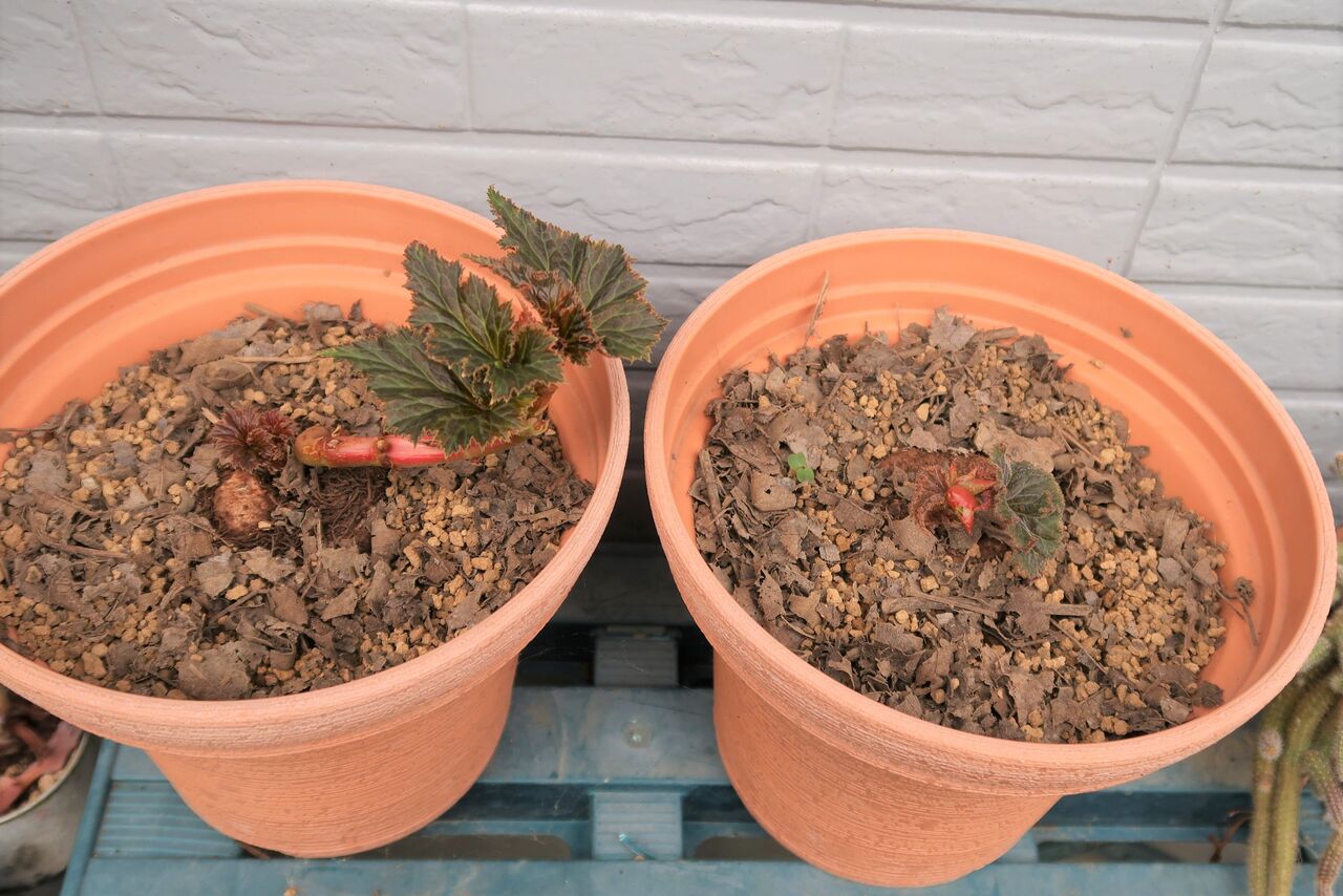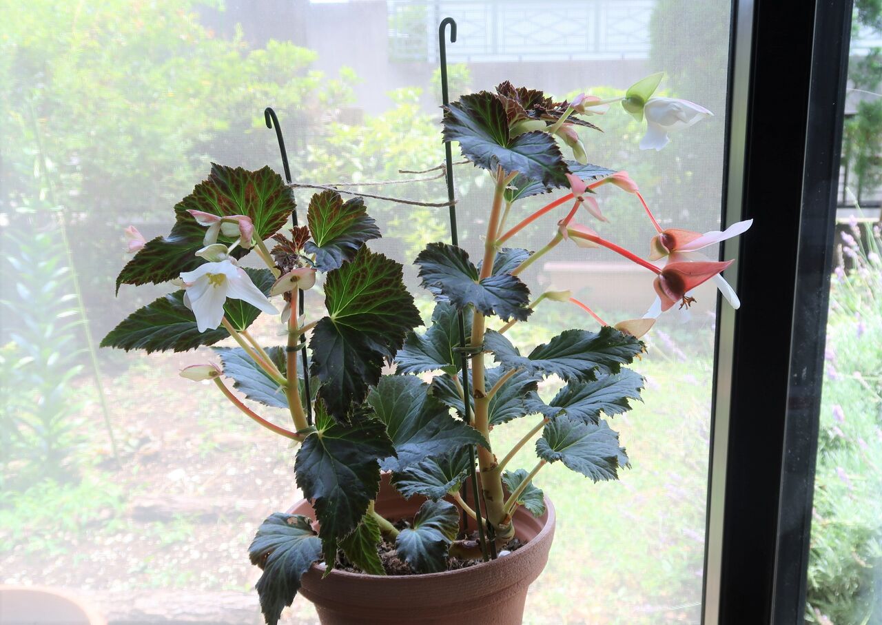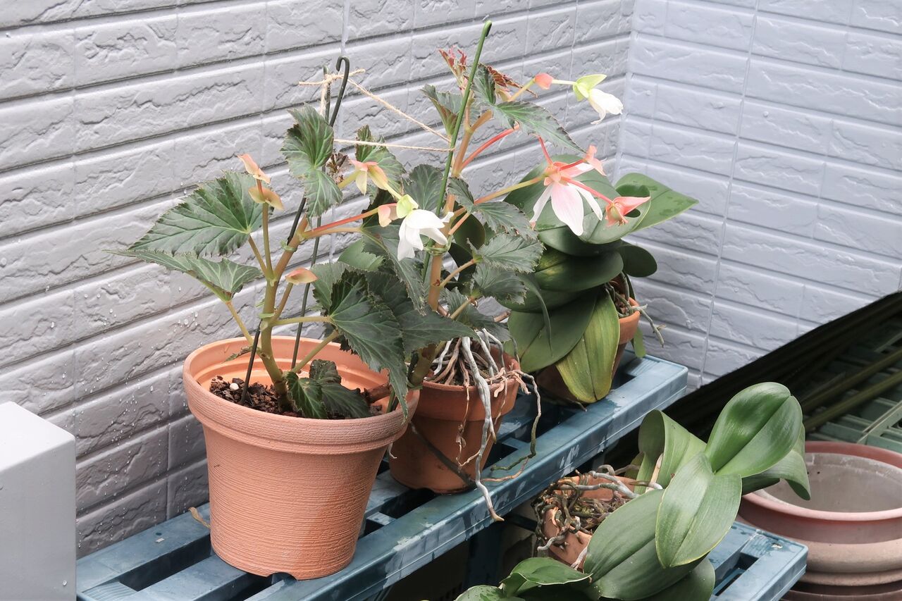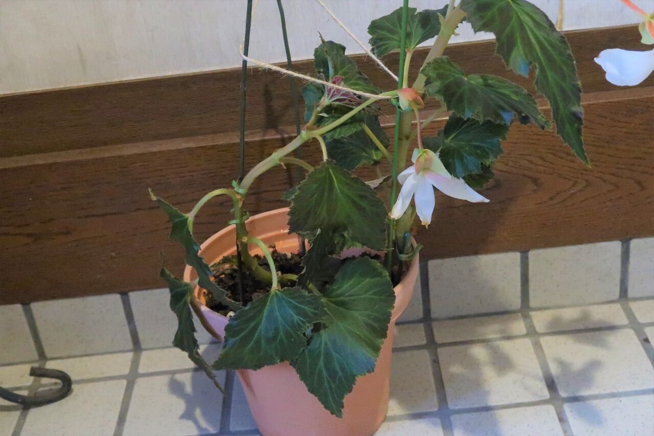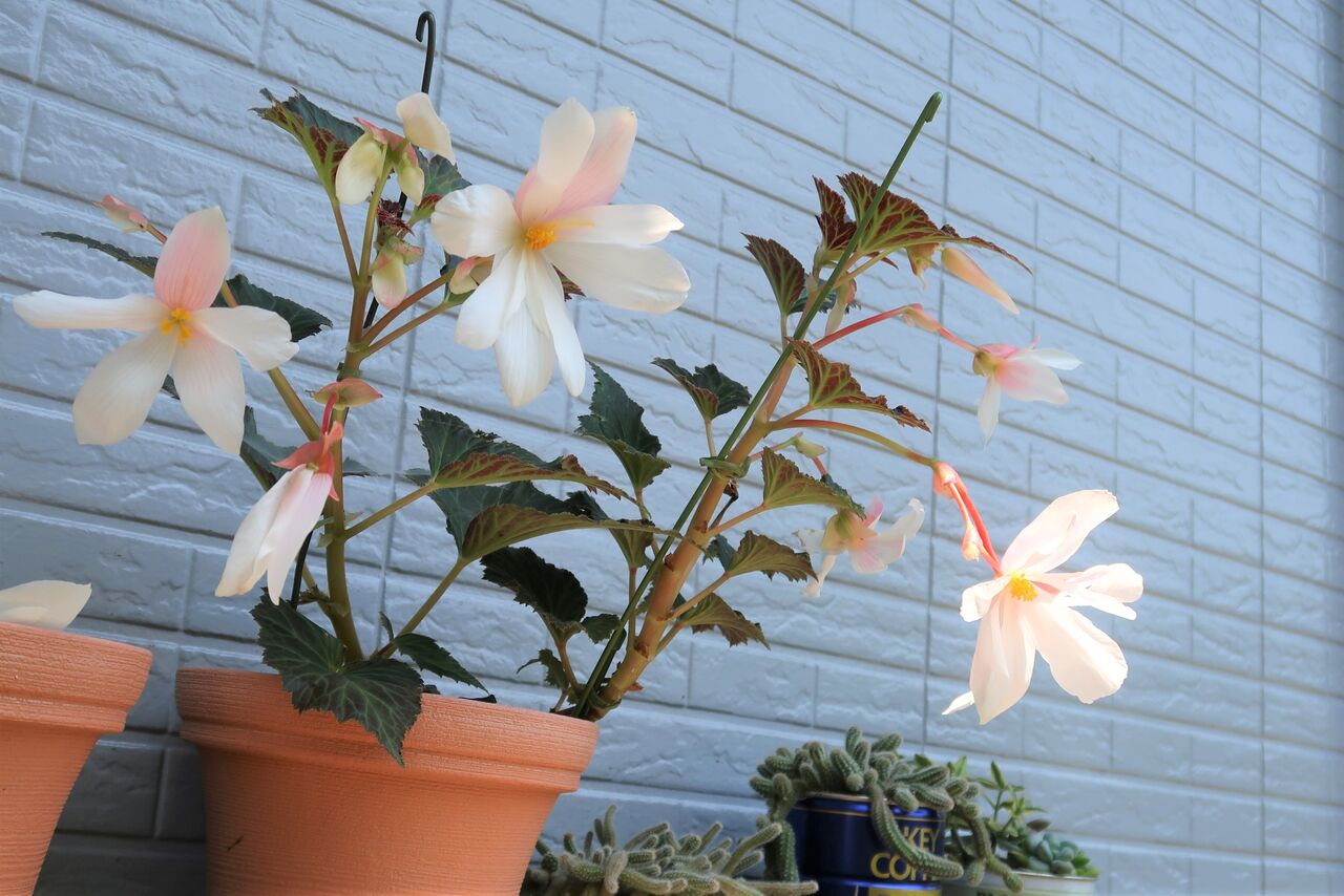 元気のない球根が気になりますが、花が咲き出したベゴニアは綺麗で家の中で眺めていたい気持ちでした。しかし、外におく方が家の中に置くより花の色は断然いいです。
