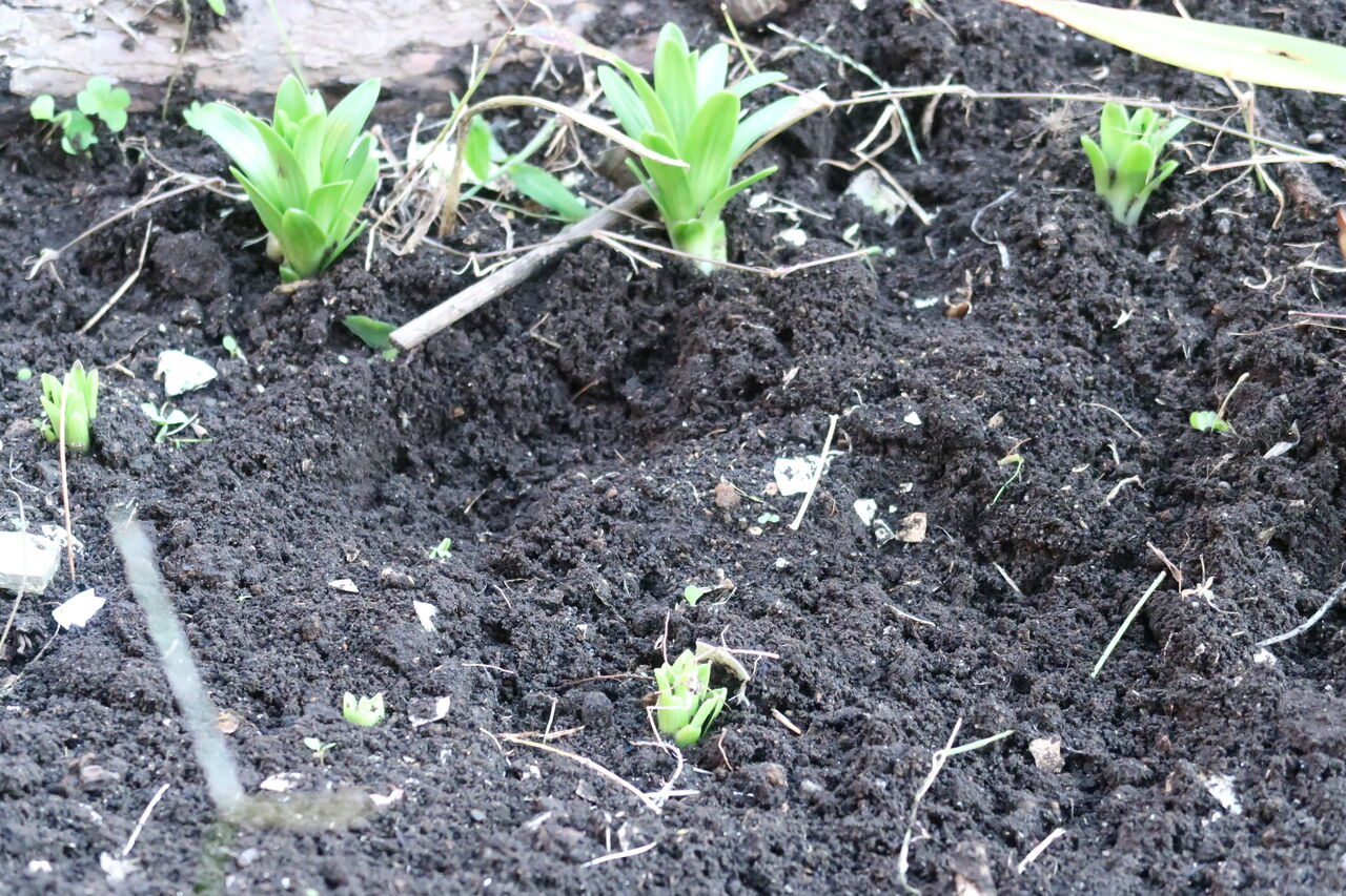 浅いところの球根もあって、深く植えなおすか、腐葉土で覆う必要があります。