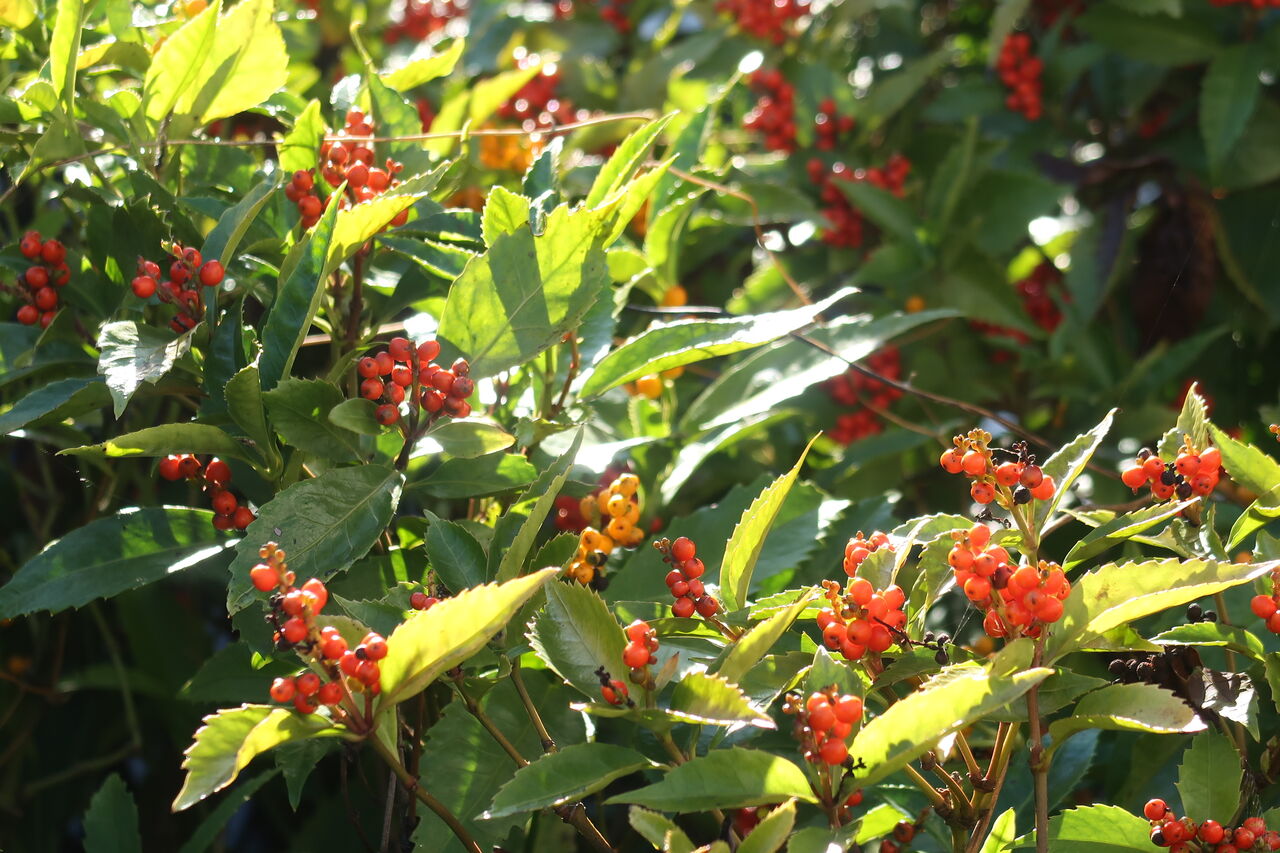千両の実を好んで食べるジョウビタキが2羽日替わりで来ます。オスはせっかちで大きな声で鳴きます。メスは小さな声で、いることがわかるくらいの静かさです。