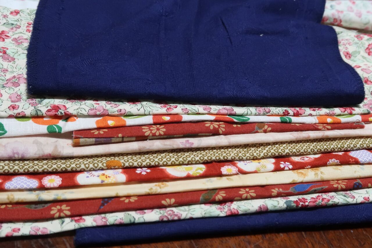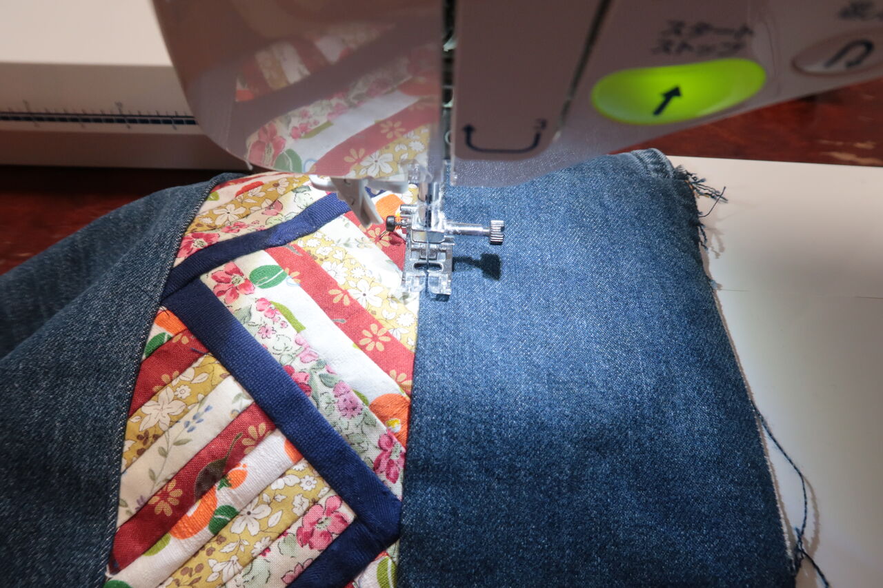 キルティング用布・・・幅3センチ×長さ60センチを必要なだけ(9本柄で両端はジーパンの色に近いもので作ります)