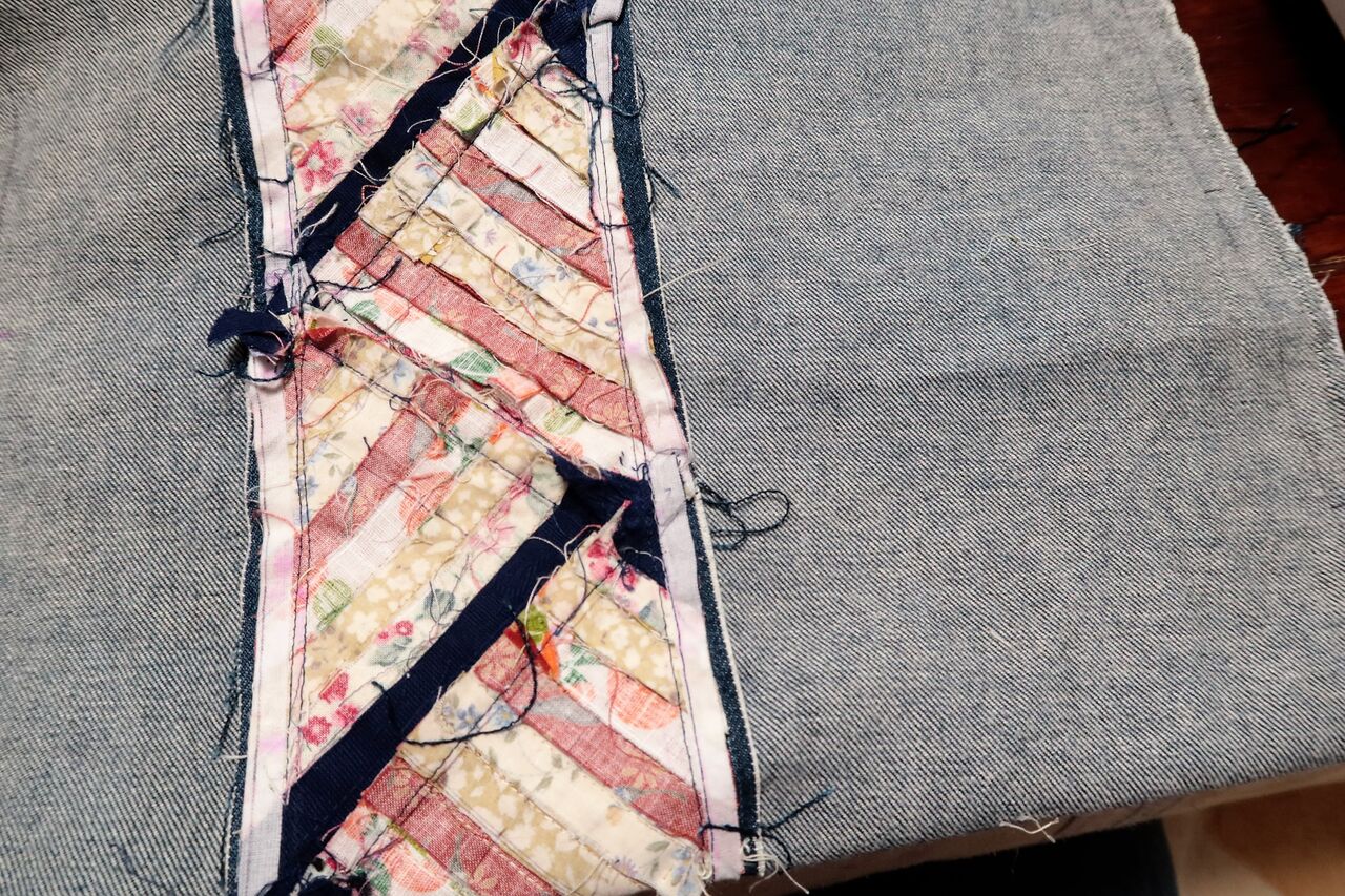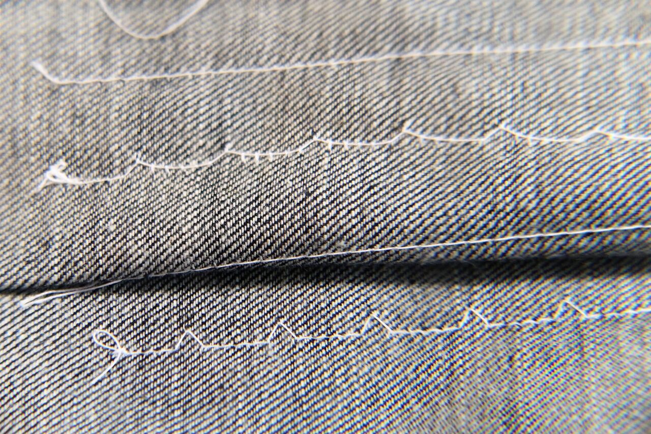 ※ジーンズは着古した癖がついていて、生地にゆがみがありました。それを考えずに縫ったのでゆがんだ縫い目になりました。