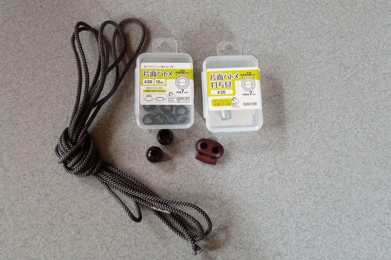ハトメの内径は、ヒモより大きくないとバッグの開け閉めがスムーズではありません。コードストッパーもヒモが大きすぎても細すぎてもうまくいきません。
