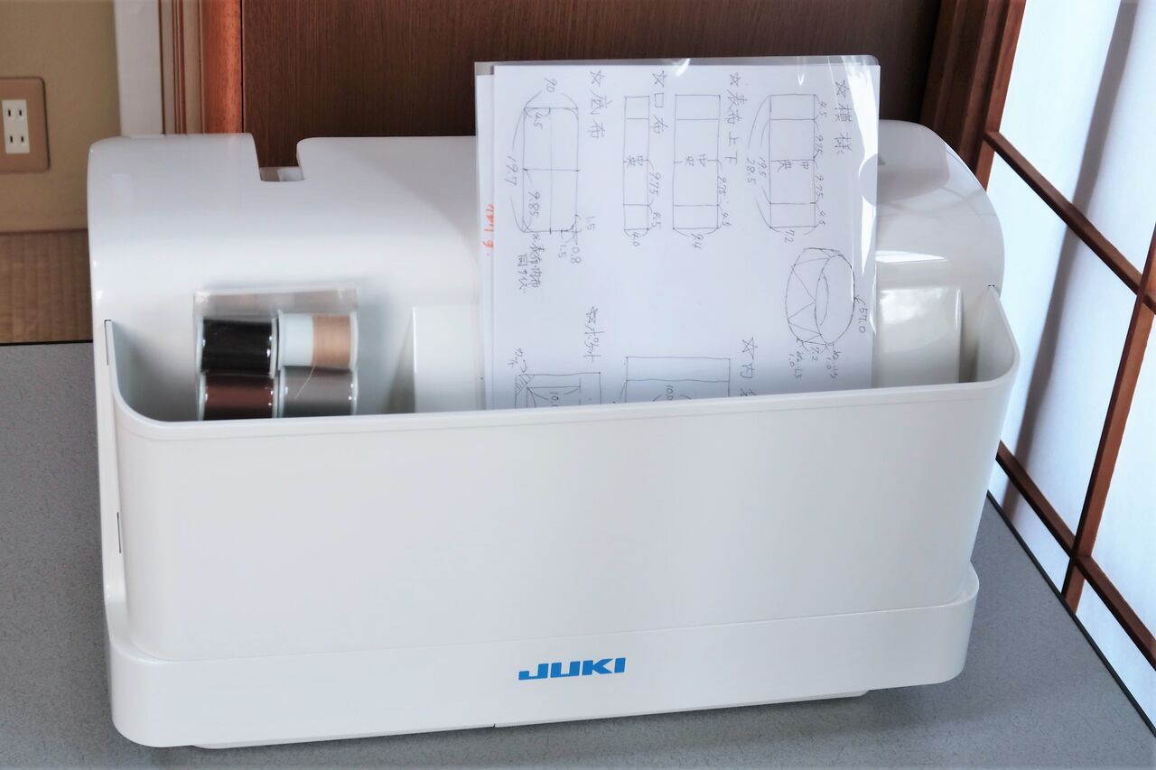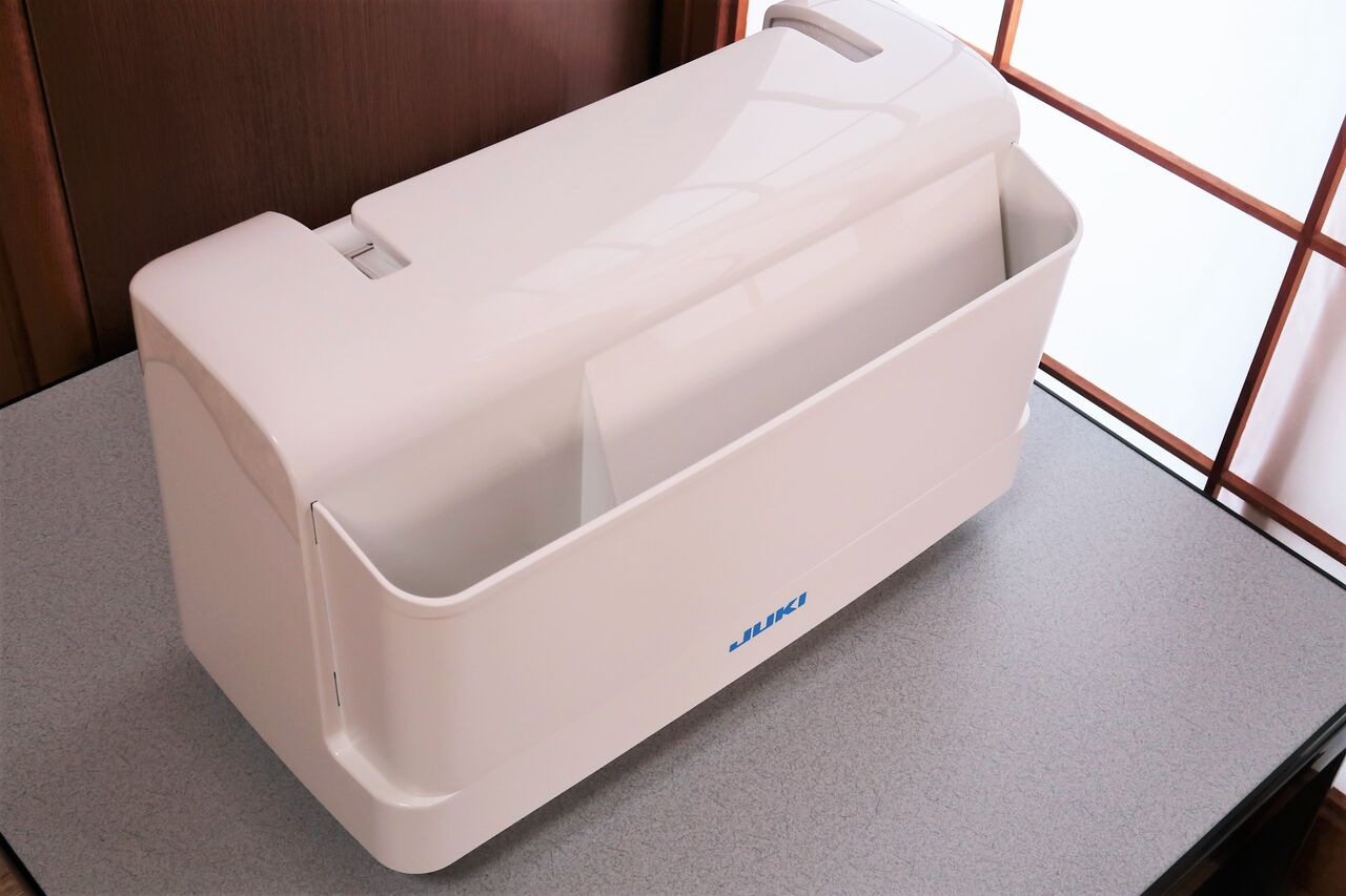 大きなボックス型のミシンカバーがあります。ミシンを使わないときはカバーをかけて置けるのもいいですね。以前はふろしきをかけておいていましたが、カバーは安全面でもいいかもしれません。