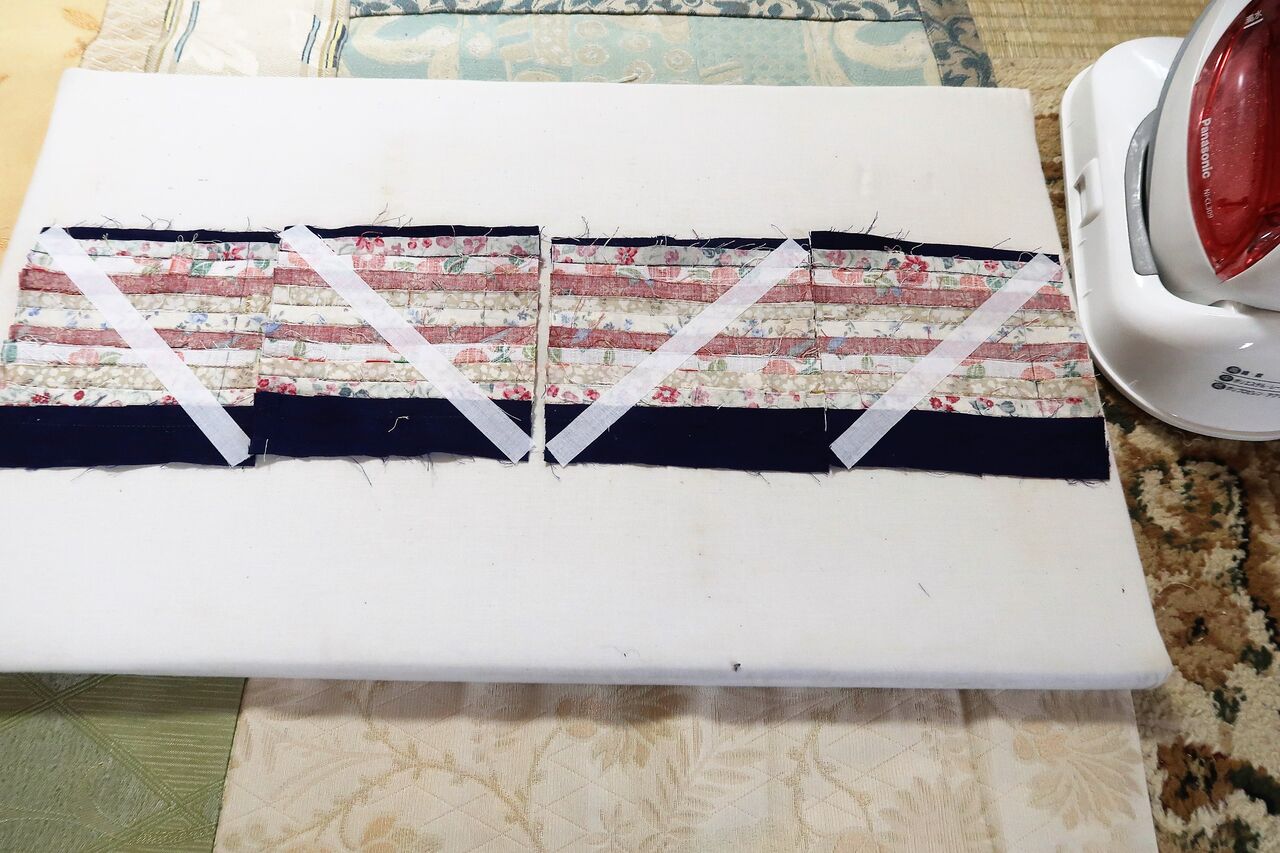 繋ぎ合わせた模様は、伸びるのを防ぐために真ん中に接着テープをアイロンで張ります。2枚ずつ違う向きにして、真ん中を切ります。この模様の作り方は本にありました。