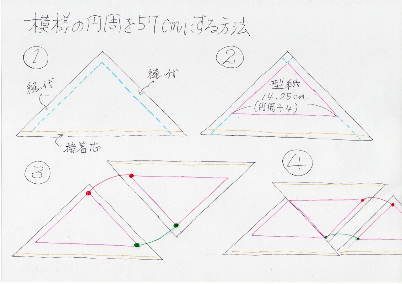 ②円周を模様の数で割ります(57センチ÷4)。その長さが模様の底辺になります。