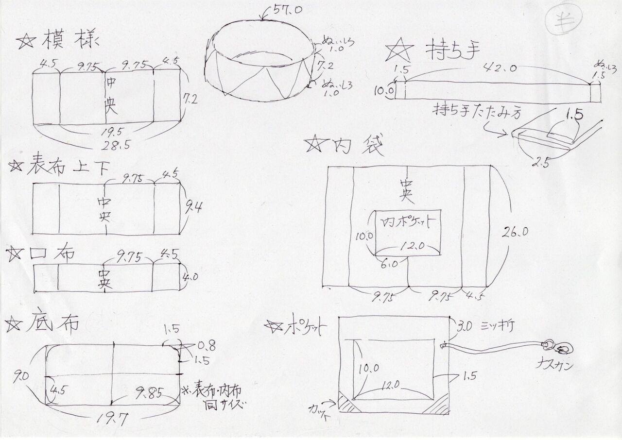 ※表布上下で4枚、口布は表裏4枚、内袋は前側にポケットを付けて、後ろ側にはつけません。持ち手の幅は3センチになるように折ります。