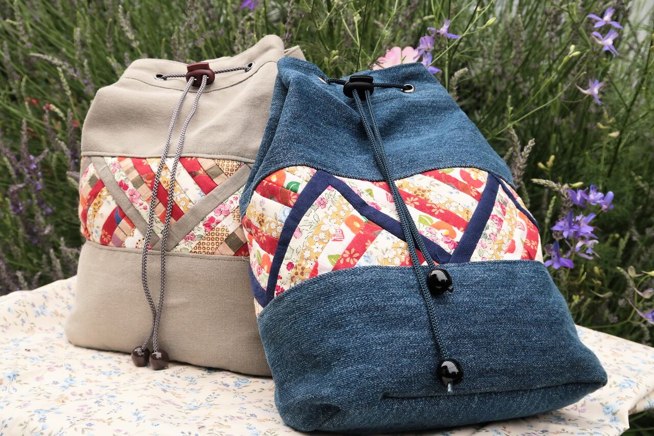 バッグは、平成9年10月6日発行の「パッチワークレッスン」(株式会社パッチワーク通信社)に掲載されていたものを見て、ハーフパンツとジーンズの古着を使って作りました。古着なので作り方を変える必要がありました。