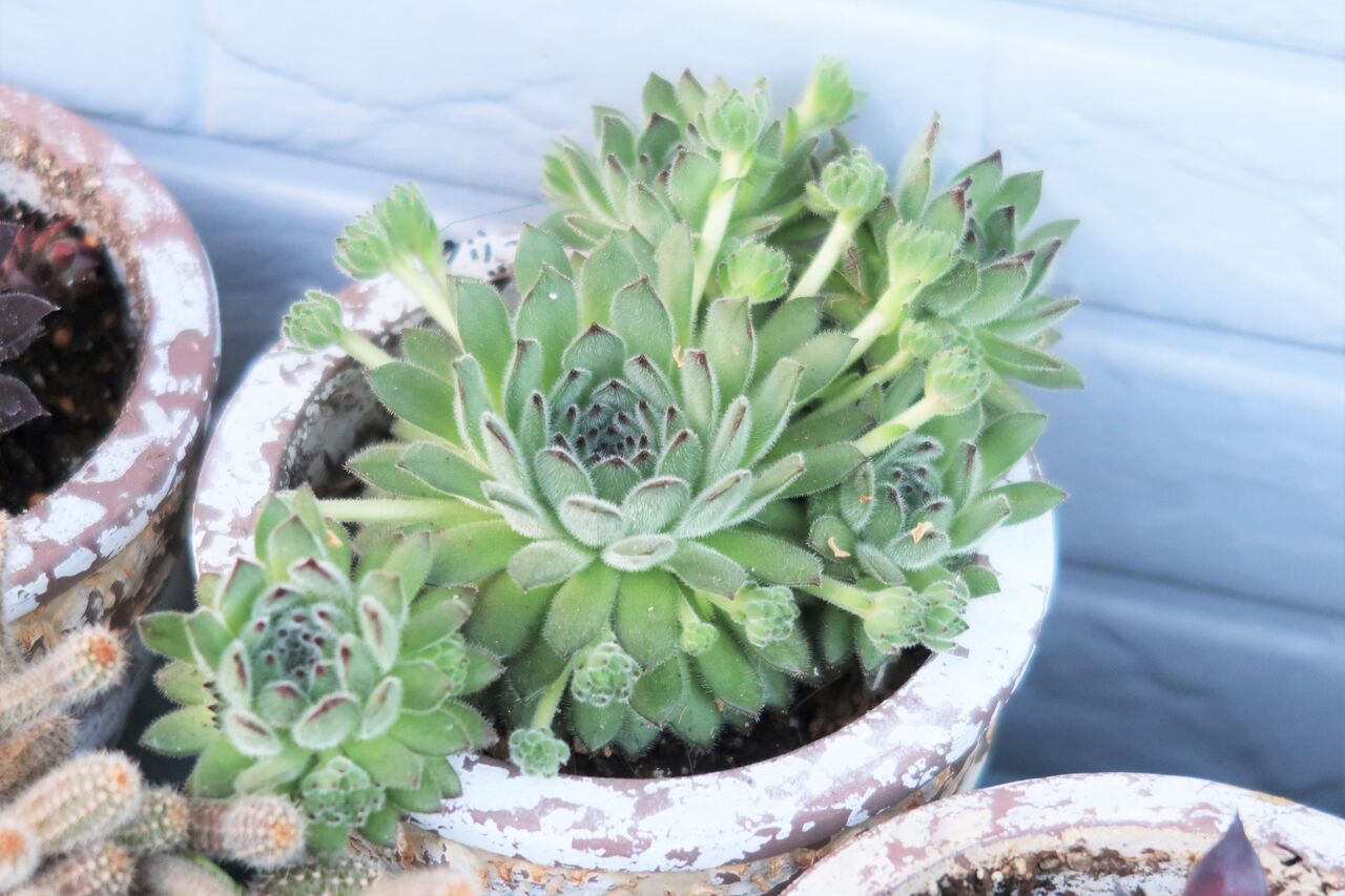 驚きの多肉、センベルビウム・グリーンバウト。子株が増えたかと思うと子株からも親株からもわしゃわしゃ花芽らしきものが出てきています。