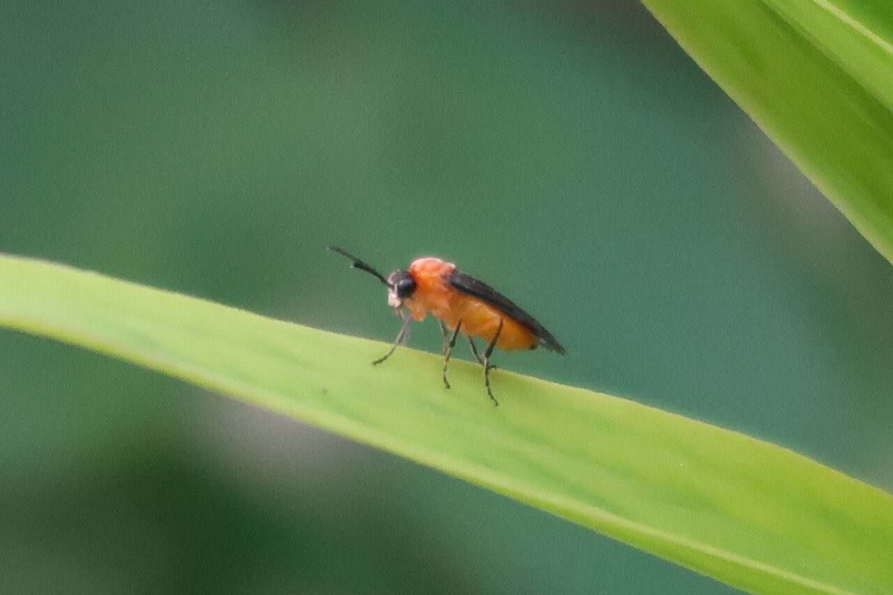 これはチュウレンバチでしょうか、今の私には捕まえることができないほど俊敏な動きをします。無駄に体力を使うのはやめようと見ていると、私の気持ちを読んだのか、一旦葉の付け根に隠れようとしていたのにまた這い出してきて、堂々とカメラ目線。