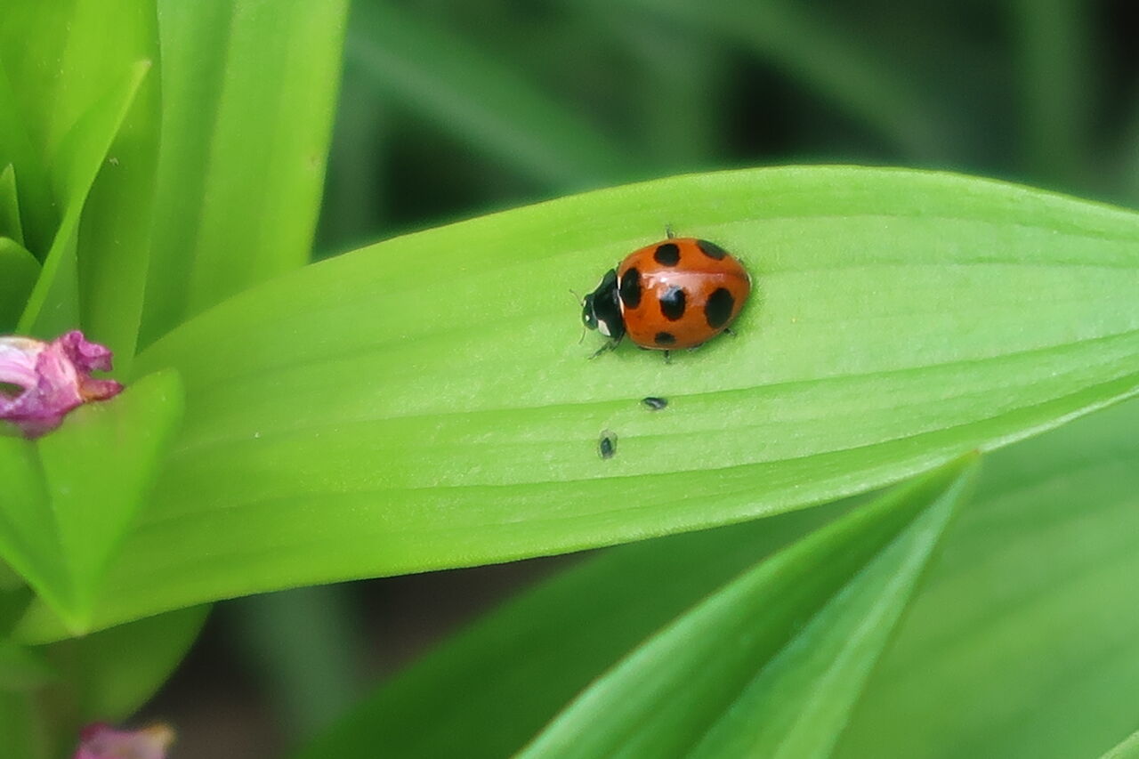 ナナホシテントウムシが葉の上にいて、コントラストがきれいです。