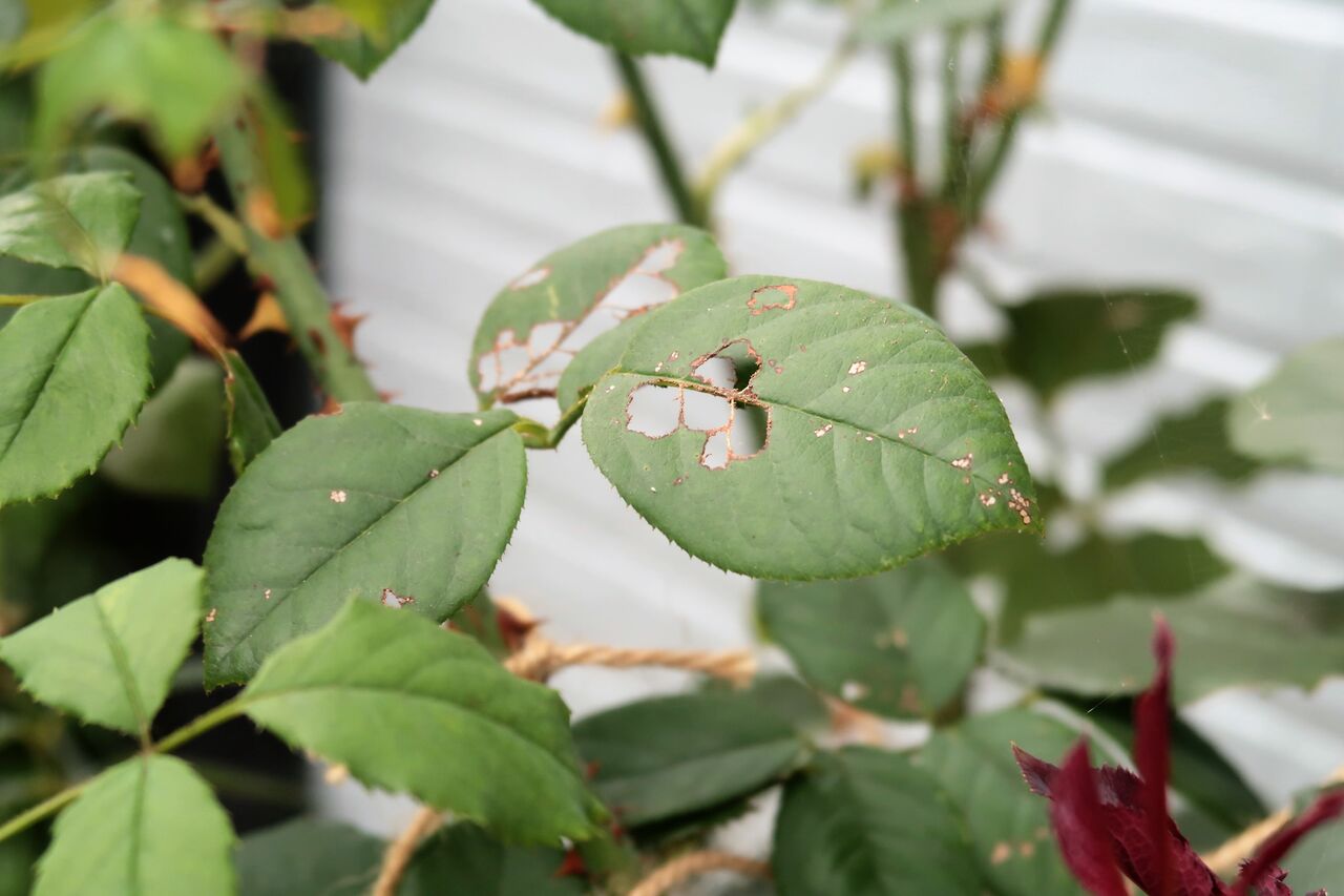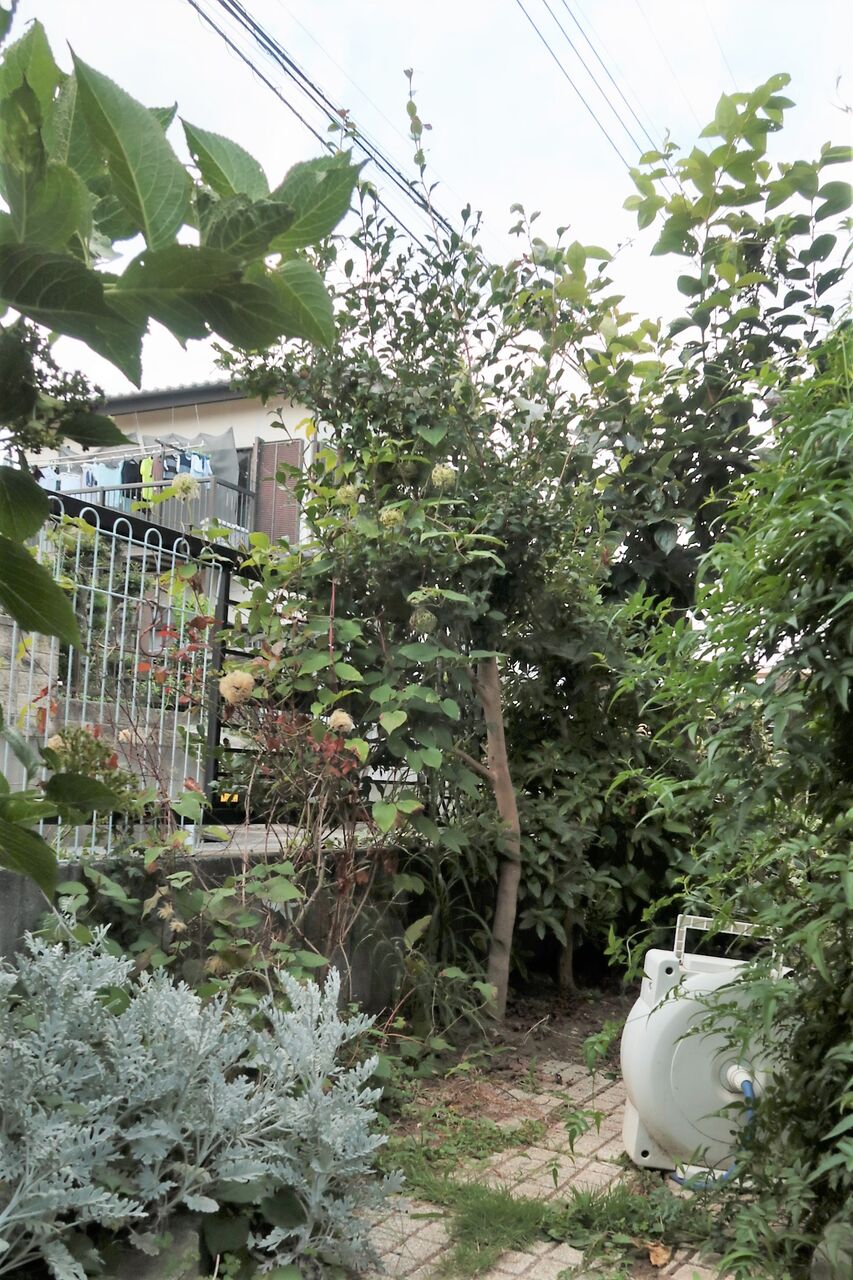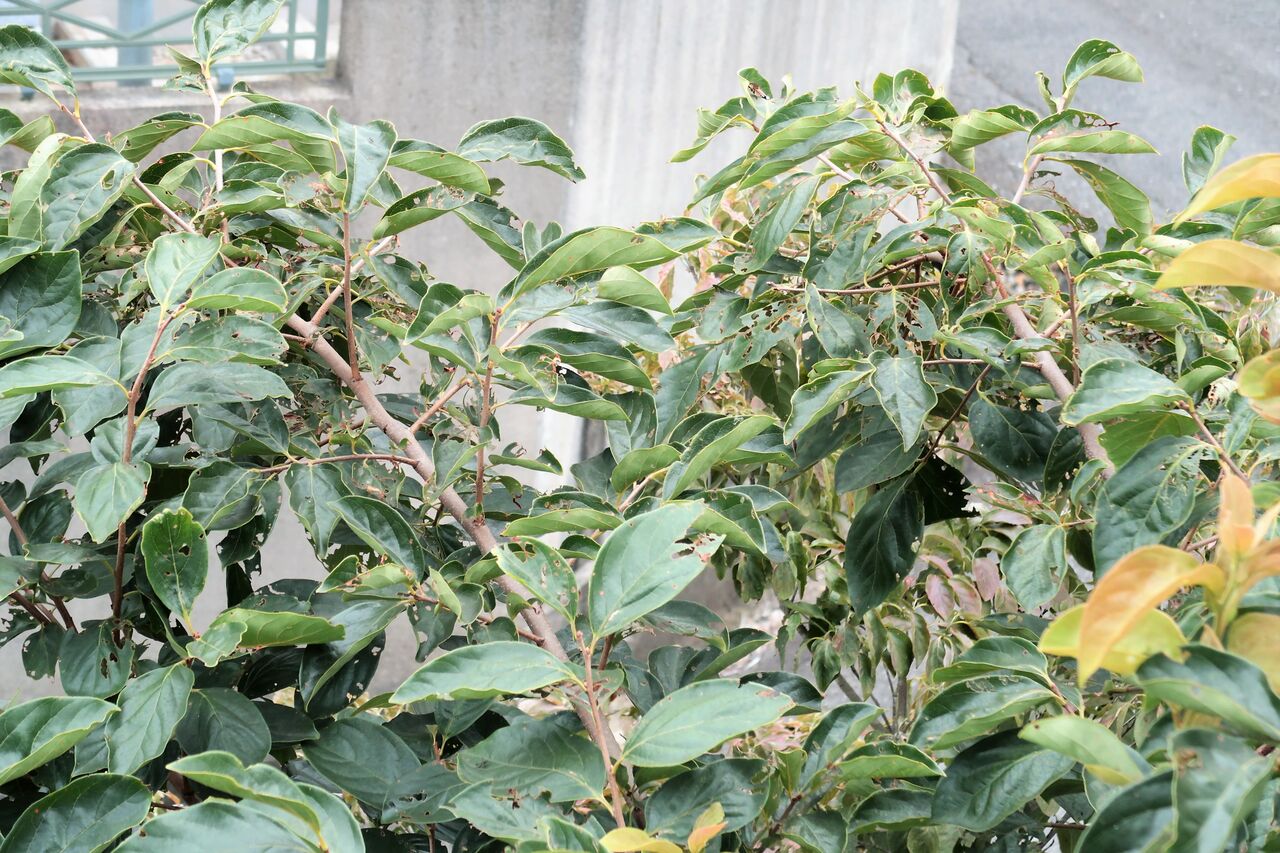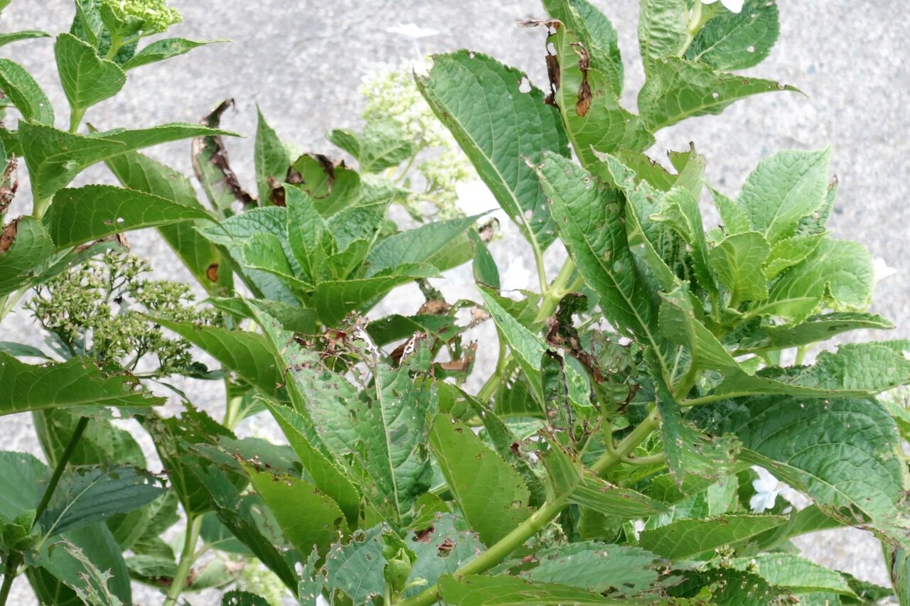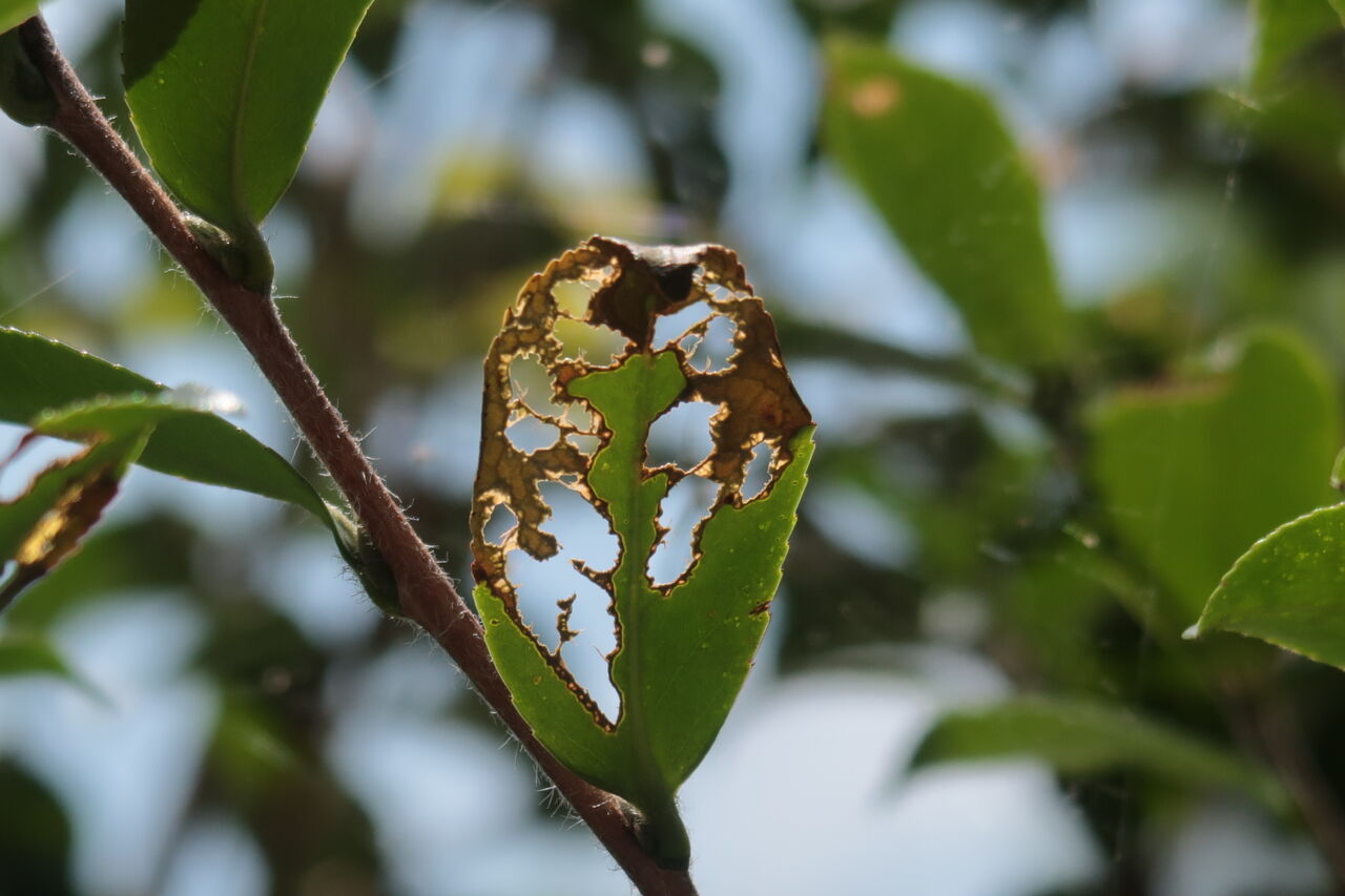庭の植物の葉が網目状になっています。どんなに目を凝らしても葉を食べてしまう犯人の姿が見えません。柿の葉、アジサイの葉、山茶花の葉、西側の道路に面した木はすべてレース状になっています。