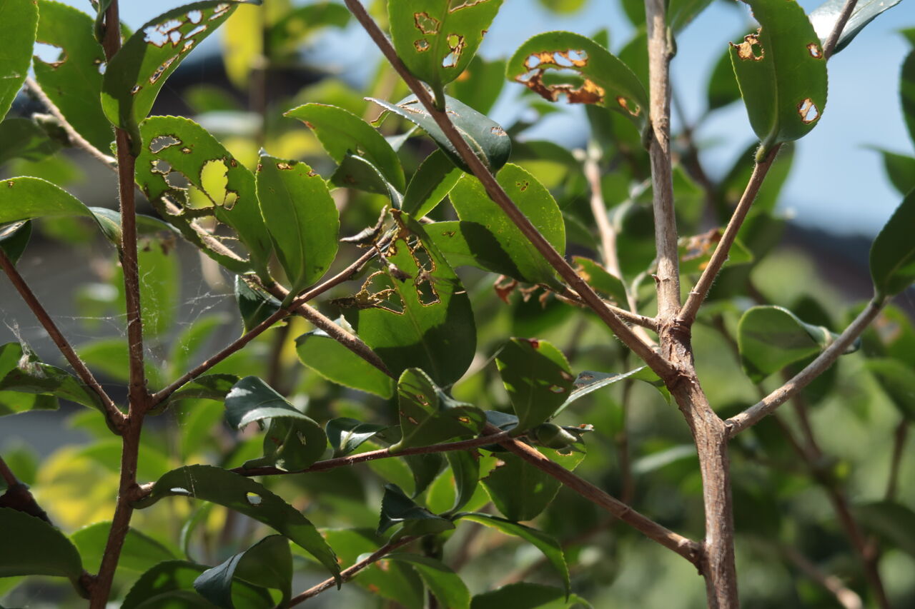 山茶花の葉がボロボロなのに、上から見ても下から見ても犯人らしき姿は見当たりません。