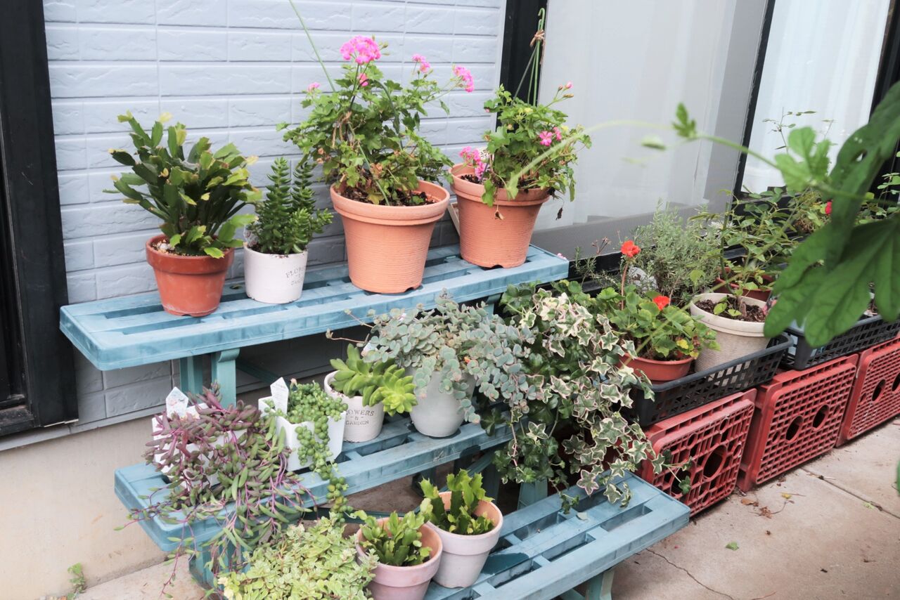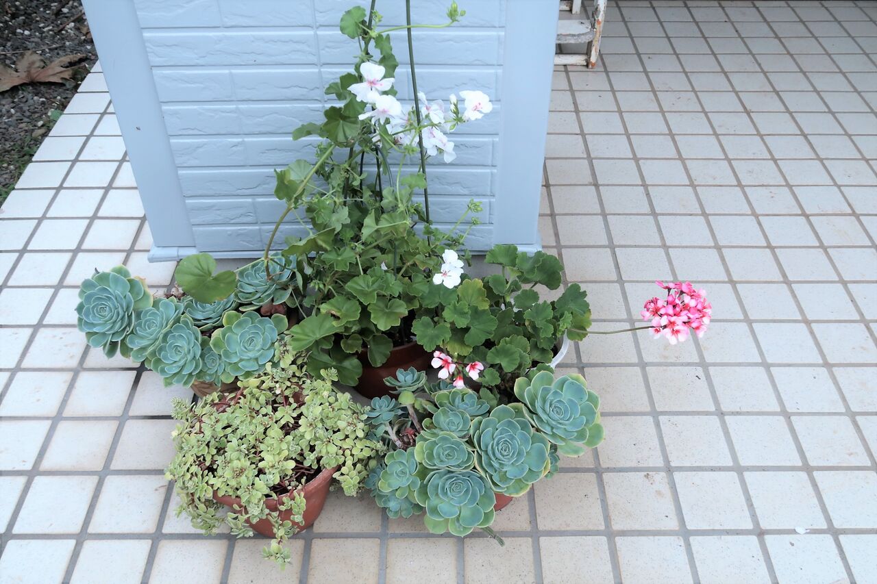 アイビーゼラニウムがきれいに咲いているので、玄関前に置いてお披露目することにしました。