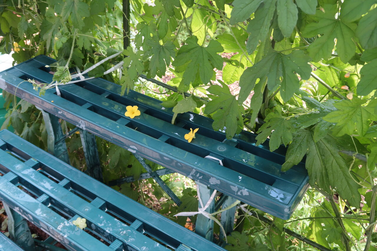 ゴーヤ棚にくくり付けた花台。カタカタ揺れることもなく安全でした。