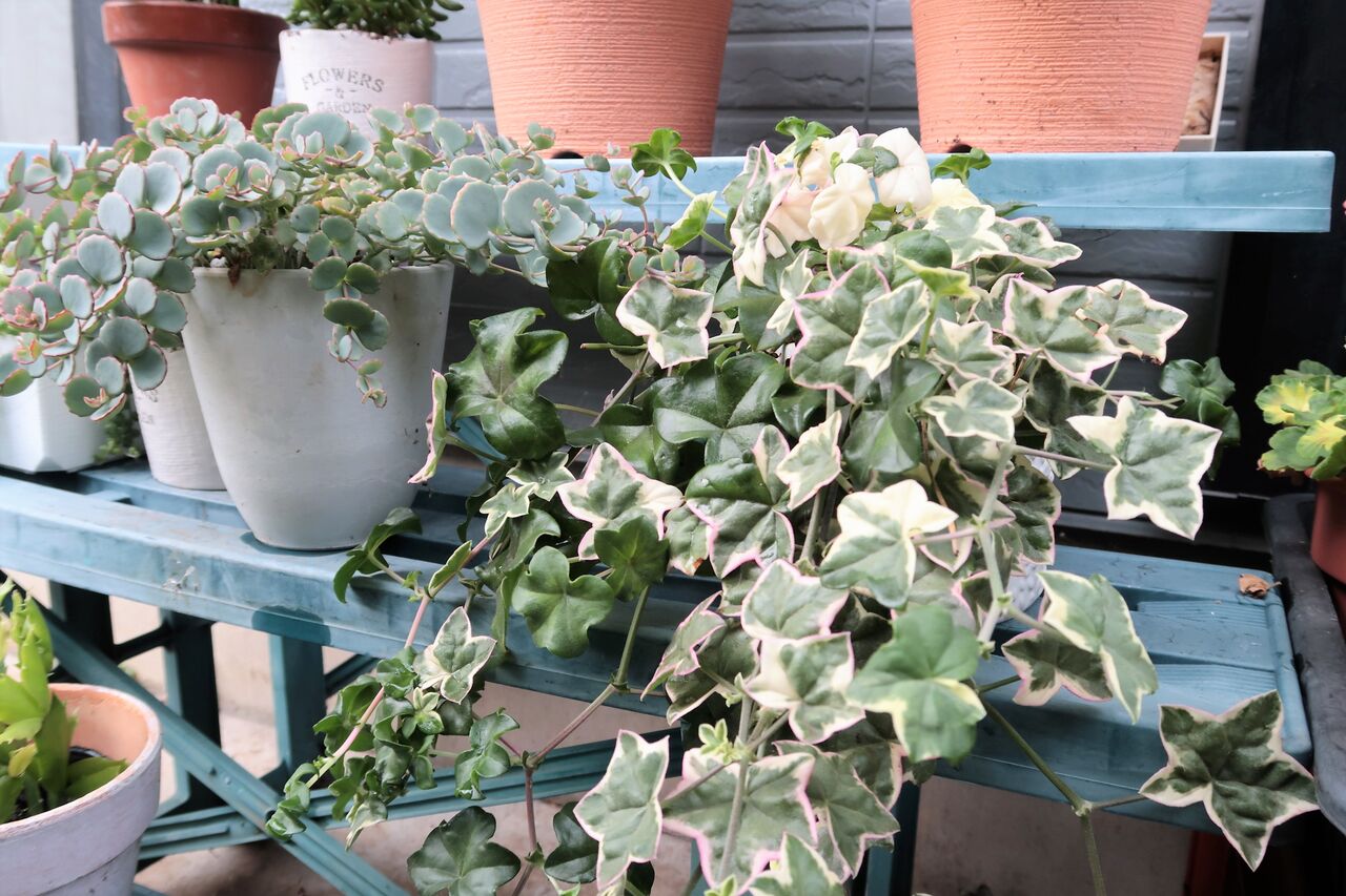 斑入りアイビーの斑が一部緑一色になっていました。多分ごちゃごちゃ置きすぎだったからだと思います。大きな鉢に植え替えて単独で咲かせたいです。大きなピンクの花を咲かせます。すごくきれいで斑の入り具合も素敵です。