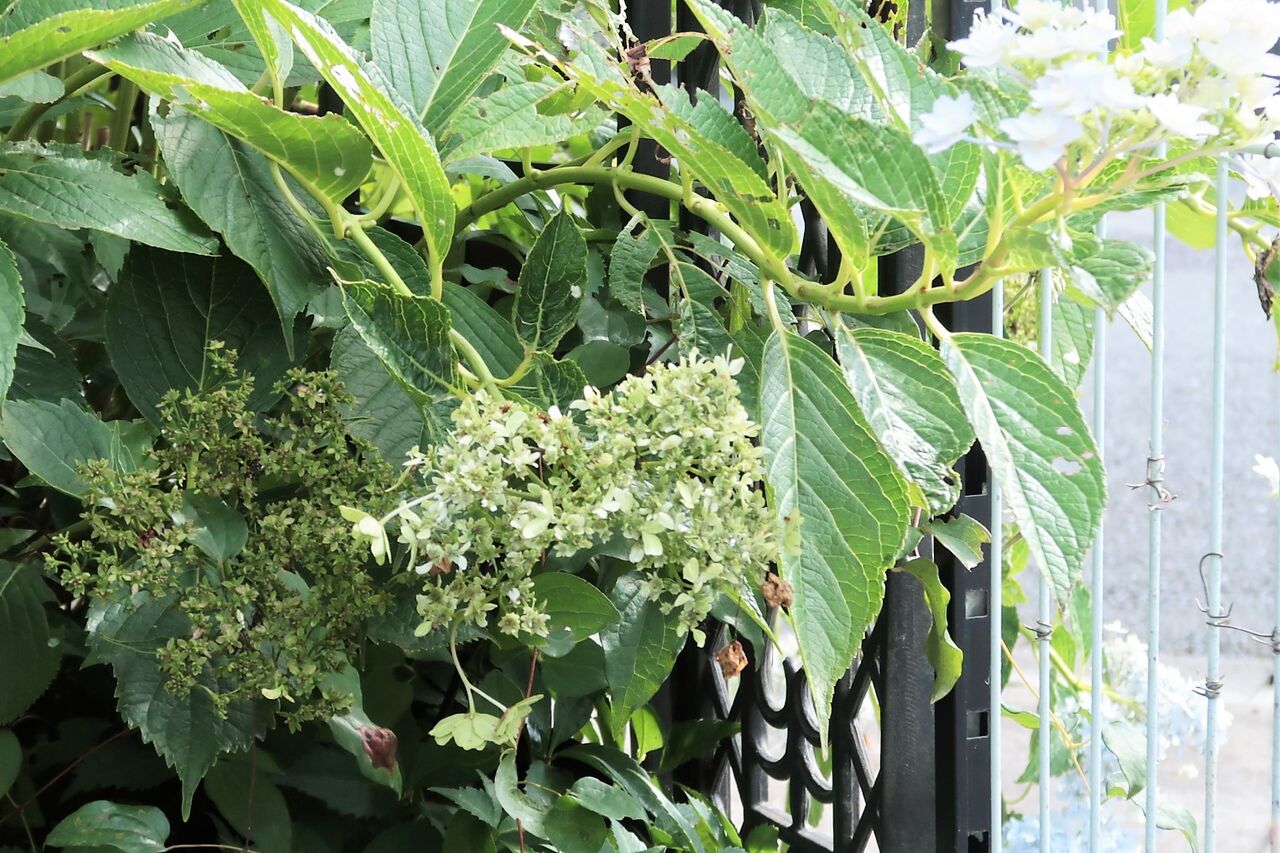 アジサイ墨田の花火はいつ剪定しても茎が1.5メートルくらいになると咲きます。6月に咲いた花と最近咲いた花とこれから咲く花が混在しています。