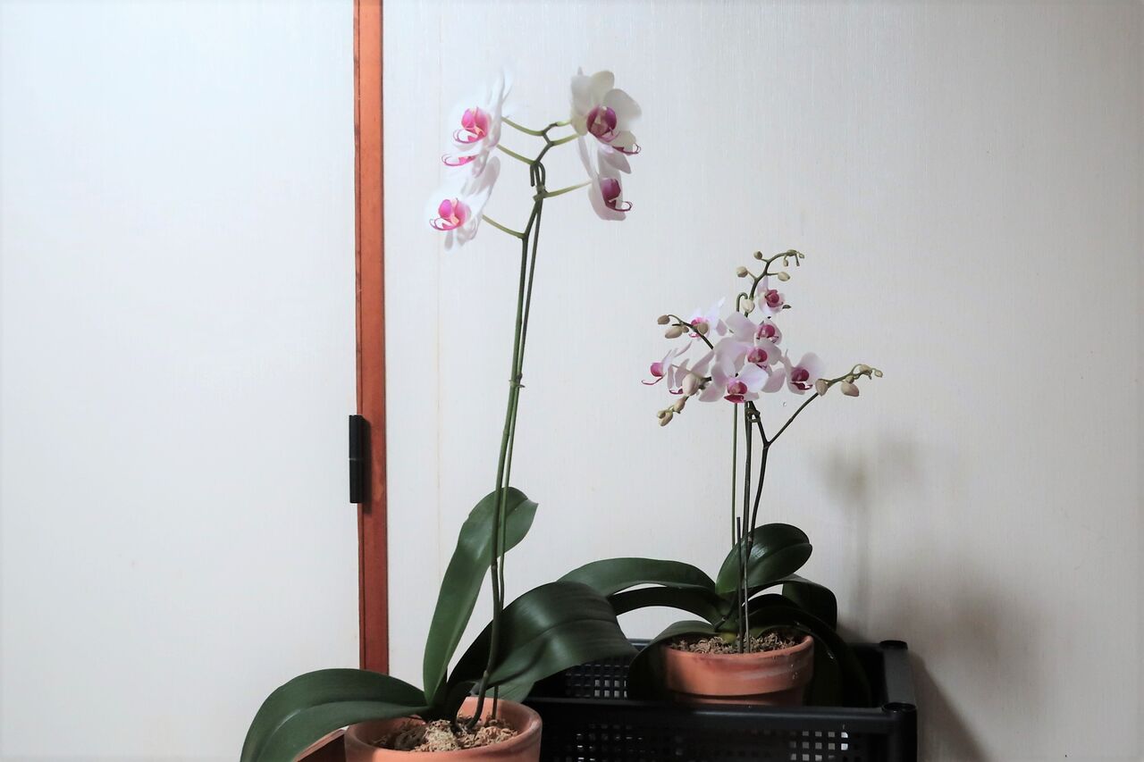 8月24日玄関で。いつもは夏は葉を育てるために、蕾は全て取り除いていました。小型の胡蝶蘭などは、頑張ってと言わんばかりに花茎2本もあります。夏なので花が咲くまでの時間が早くて、花も少し小さめです。