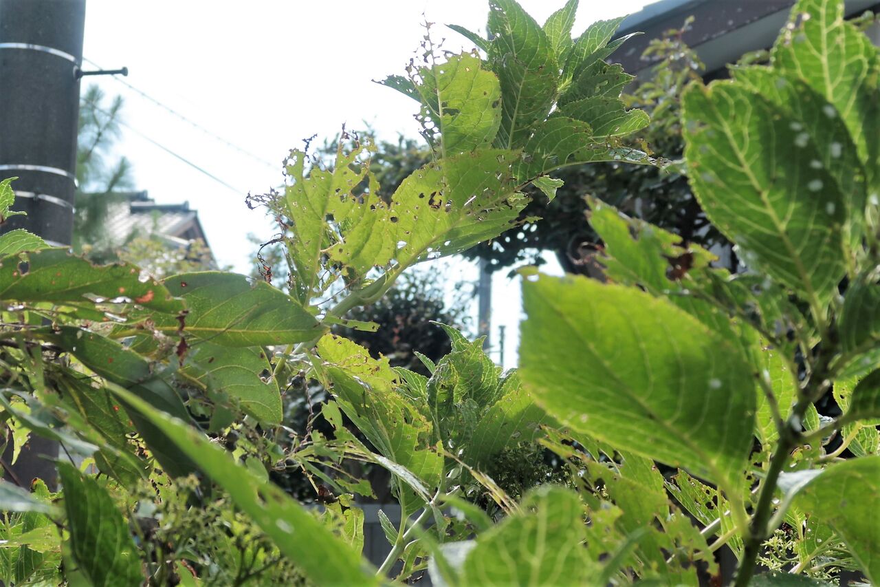 しかし今年のアジサイはカナブンに葉をかじられて、カイガラムシもついて汚いです。