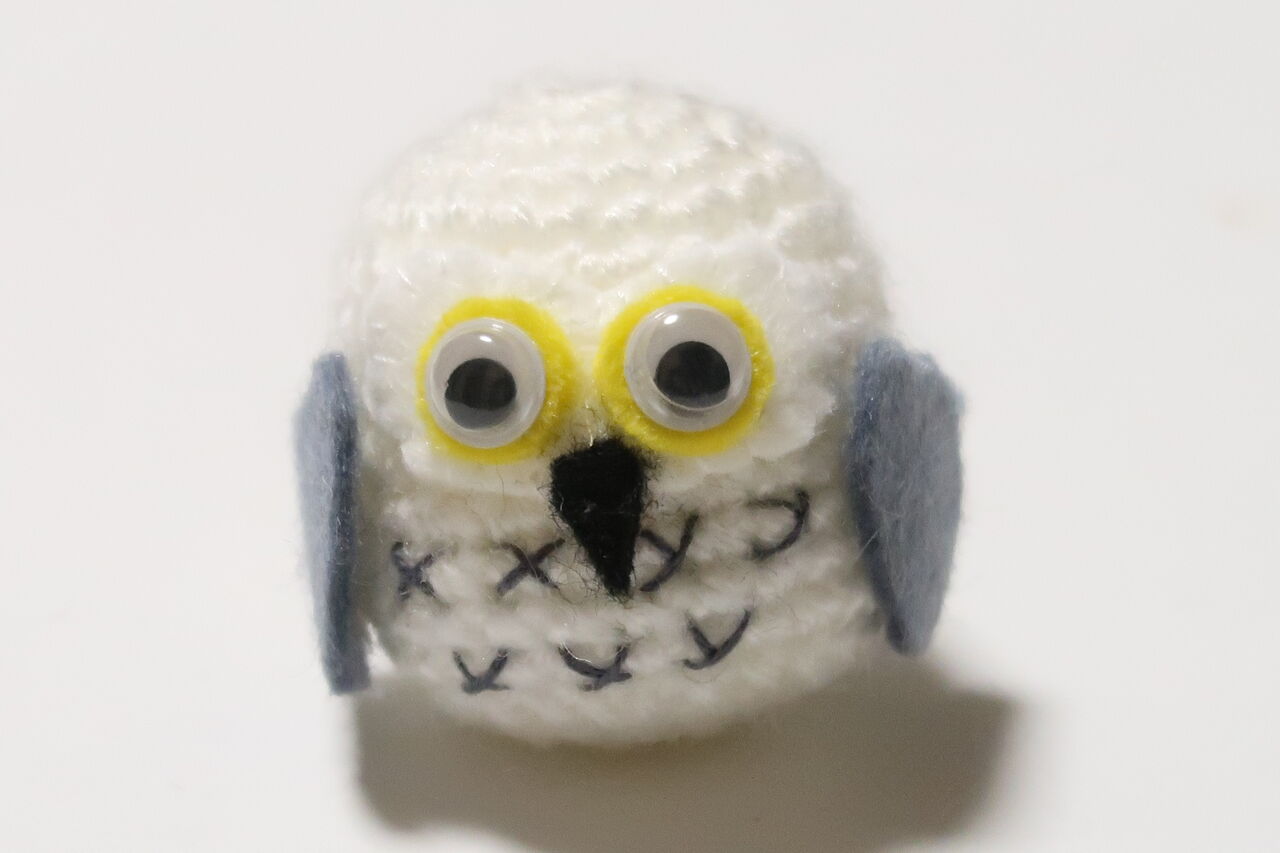 冬になると白い羽になるフクロウがいます。白で編んで、目の周りも白のフェルトなので目立たせるために黄色のフェルトで目の下に貼ってみました。○○というキャラに似ていると言われました。○○・・・て、なんだっけ・・